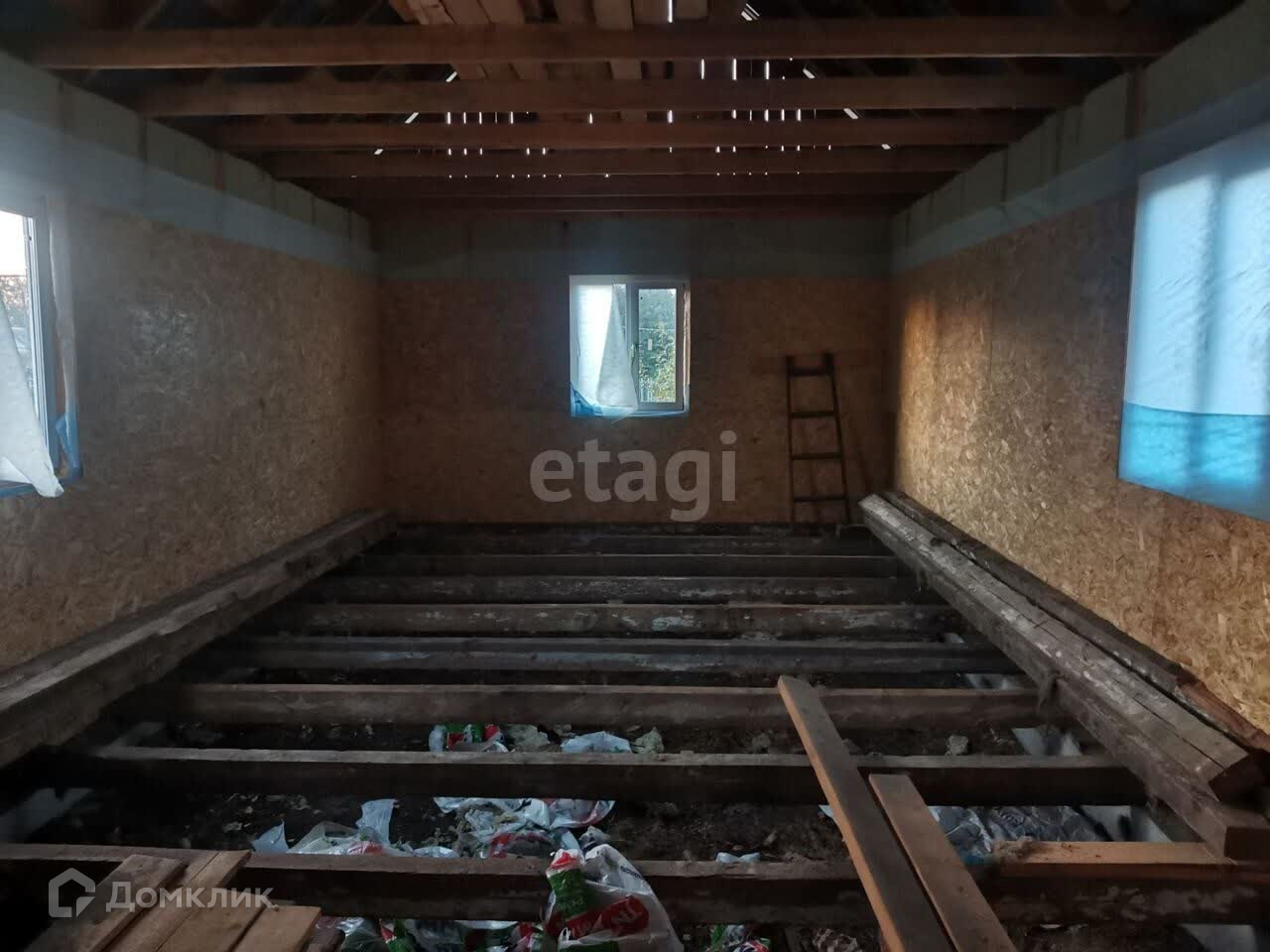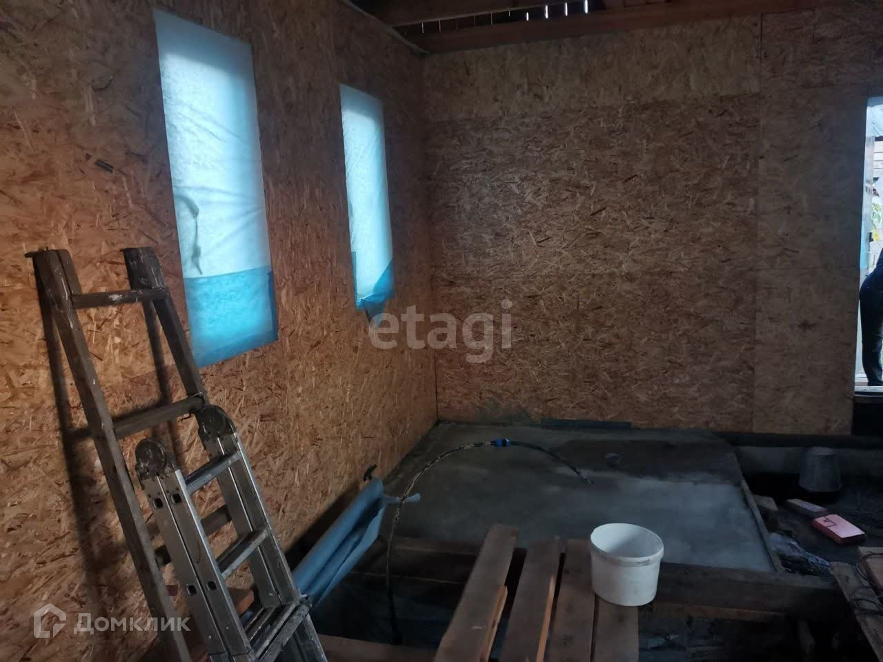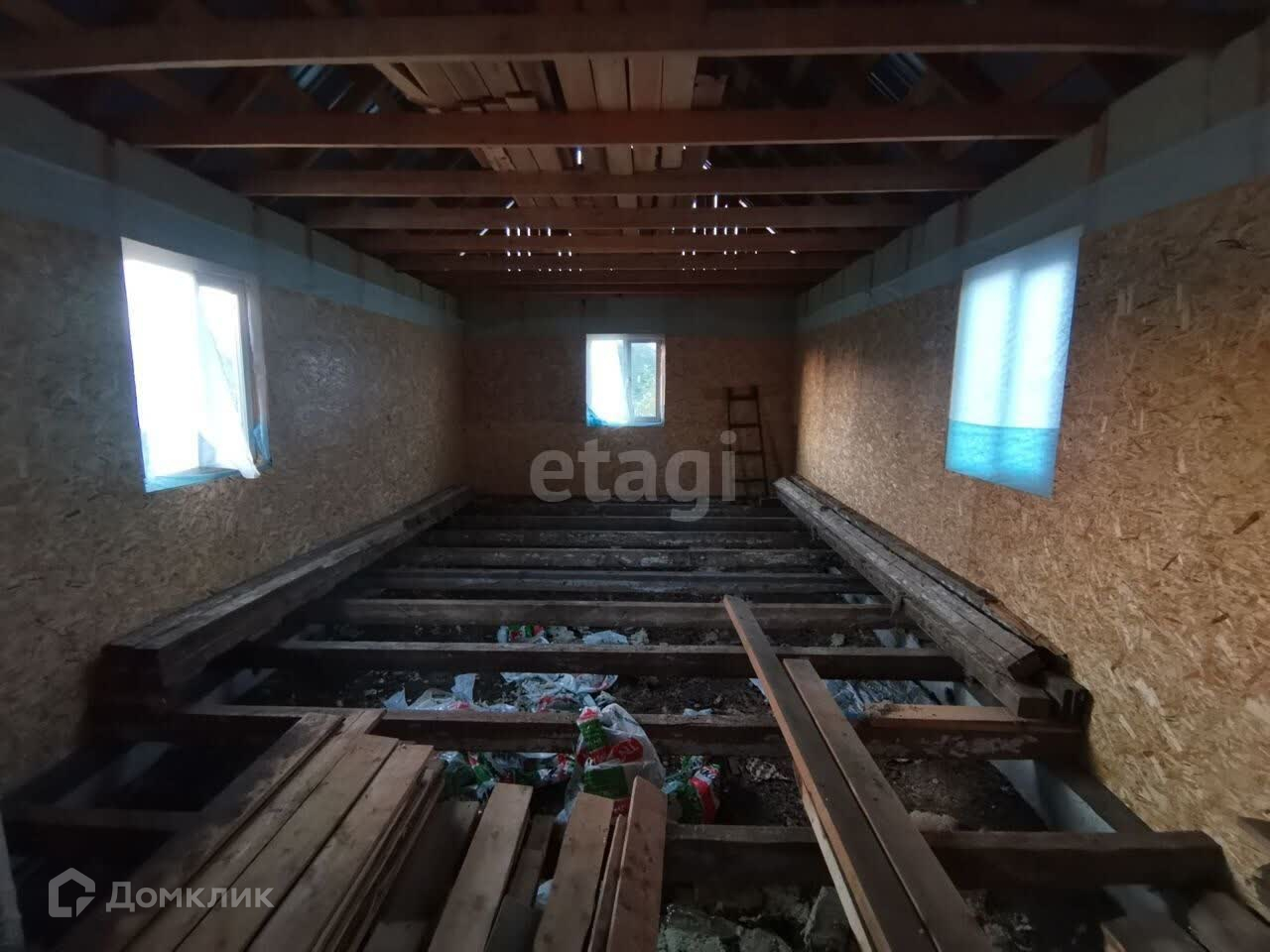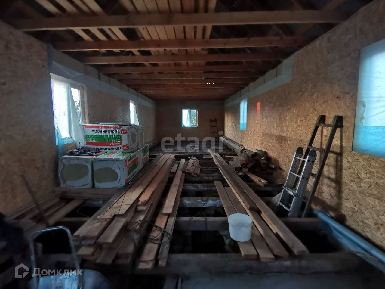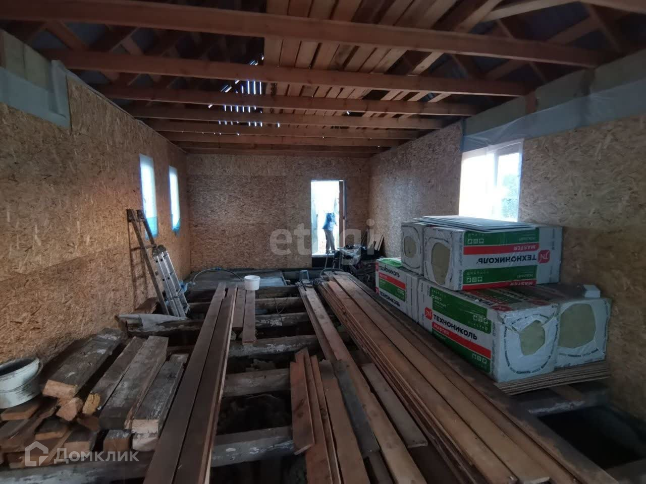 Дом обшит снаружи досками, крыша сделана, установлены пластиковые окна. Утепление выполнено базальтовой ватой толщиной 20 см. Стены частично обшиты ОСБ. Остаётся подшить потолок и установить пол. Зимний водопровод проведён, удобное расположение обеспечено. Широкая дорога и подъезд с двух сторон делают этот дом идеальным для жизни.