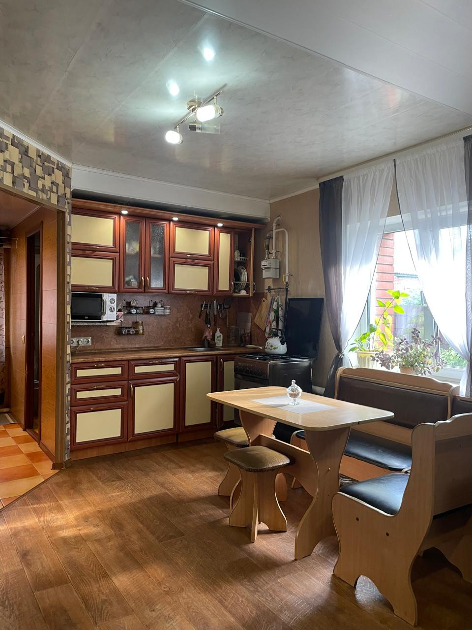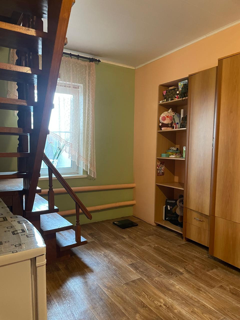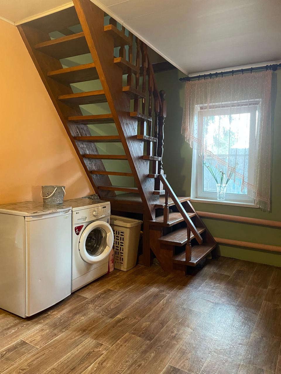 На первом этаже кухня-гостиная, спальня, холл с лестницей.