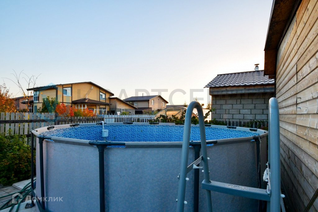 Участок огорожен, проведено благоустройство: дорожки вымощены, высажены декоративные и плодовые деревья, газон, установлена мангальная зона, имеется уличный бассейн, выделено место под огород, есть 2 теплицы.