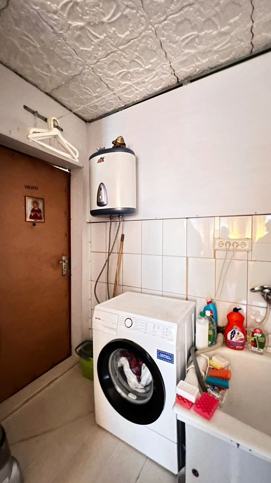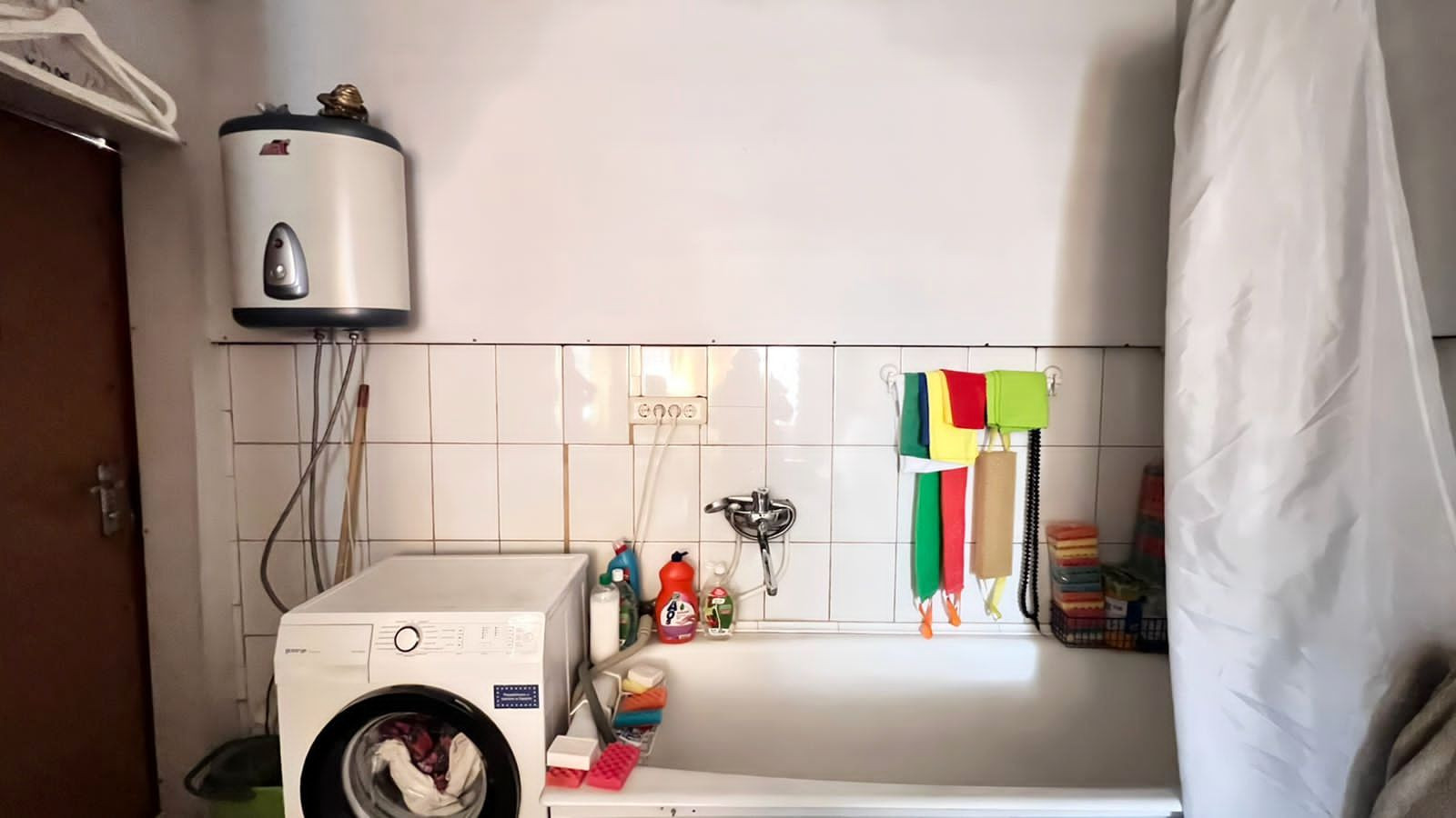 Комната теплая, заведена вода. В комнате есть ванна, стиральная машина, холодильник, и это все, остается при продаже.