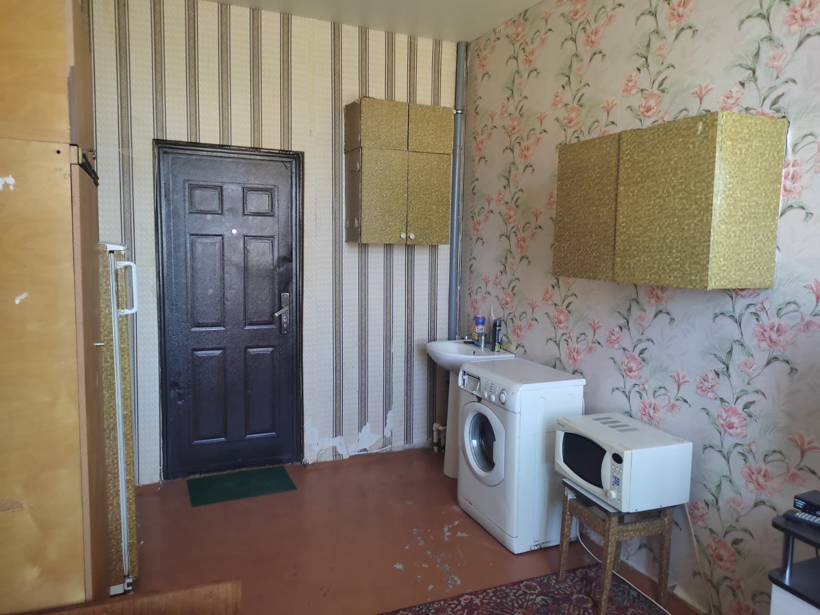 Комната находится в кирпичном доме, который расположен в 7 минутах езды от ж/д вокзала. В комнате проведена вода, установлена стиральная машина и раковина.