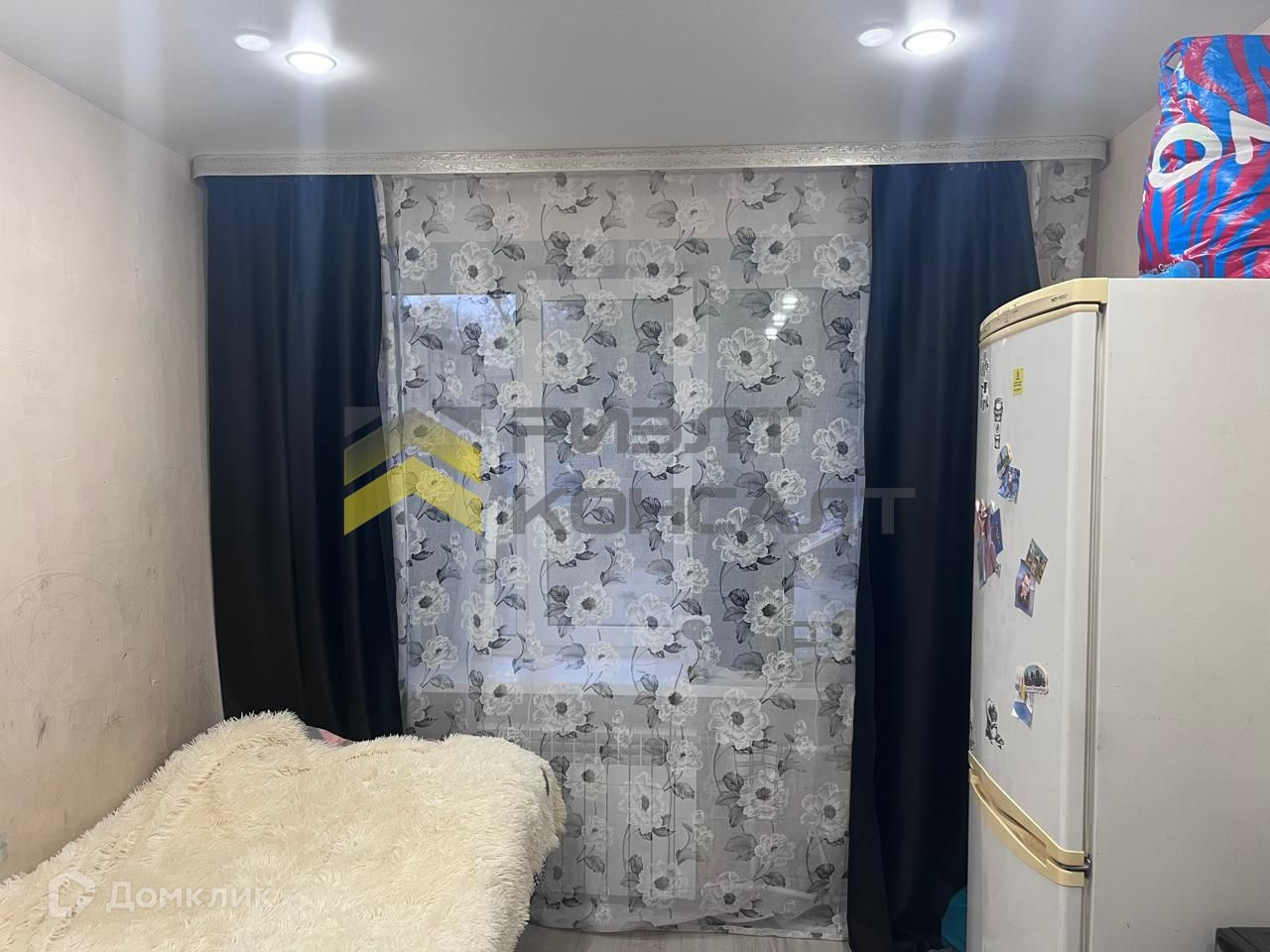 Комната очень теплая, не угловая. Выполнен хороший ремонт. Натяжной потолок, поклеены обои, на полу постелен линолеум.
