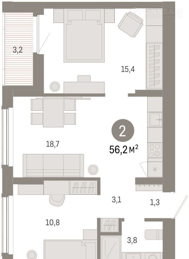 Квартира с кухней-гостиной и двумя спальнями в Кварталах Драверта. Особенности планировки: тёплая лоджия, разнесённые спальни, предчистовая отделка.