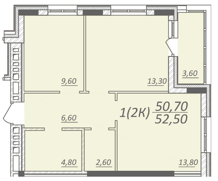 Площадь квартиры 52,4 кв.м. + 3.0 кв.м. лоджия. Высота потолков 2,7 м. Имеется  гардеробная площадью 3,0 кв.м.