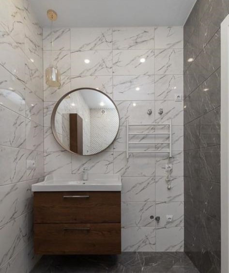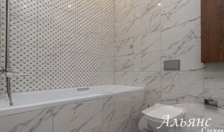 Мраморная кафельная плитка в просторной ванной, с очень качественной сантехникой. Шкафы для хранения в ванной, электрический полотенцесушитель, инсталляция, вместительная тумба с раковиной, зеркало с подсветкой.