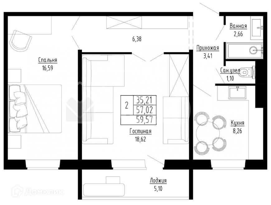 Общая площадь 59.57 м2