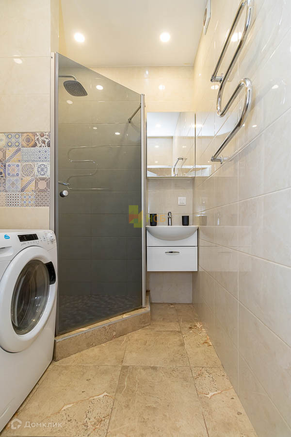 в санузле: установлена сантехника Grohe, душевая кабина, стиральная машина с сушкой Candy, подвесная тумба, полотенцесушитель, бойлер для нагрева воды;