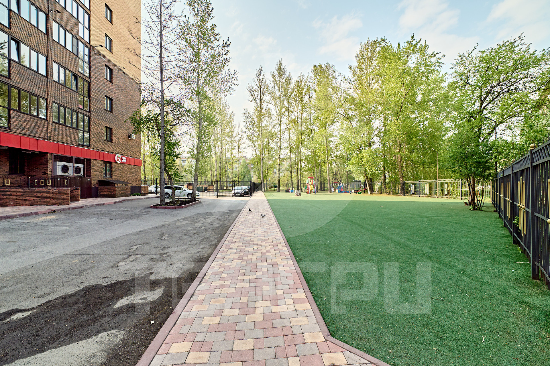Спортивная площадка с мягким зеленым искусственным покрытием. Тротуары и проезды вымощены цветной брусчаткой, качественный асфальт.