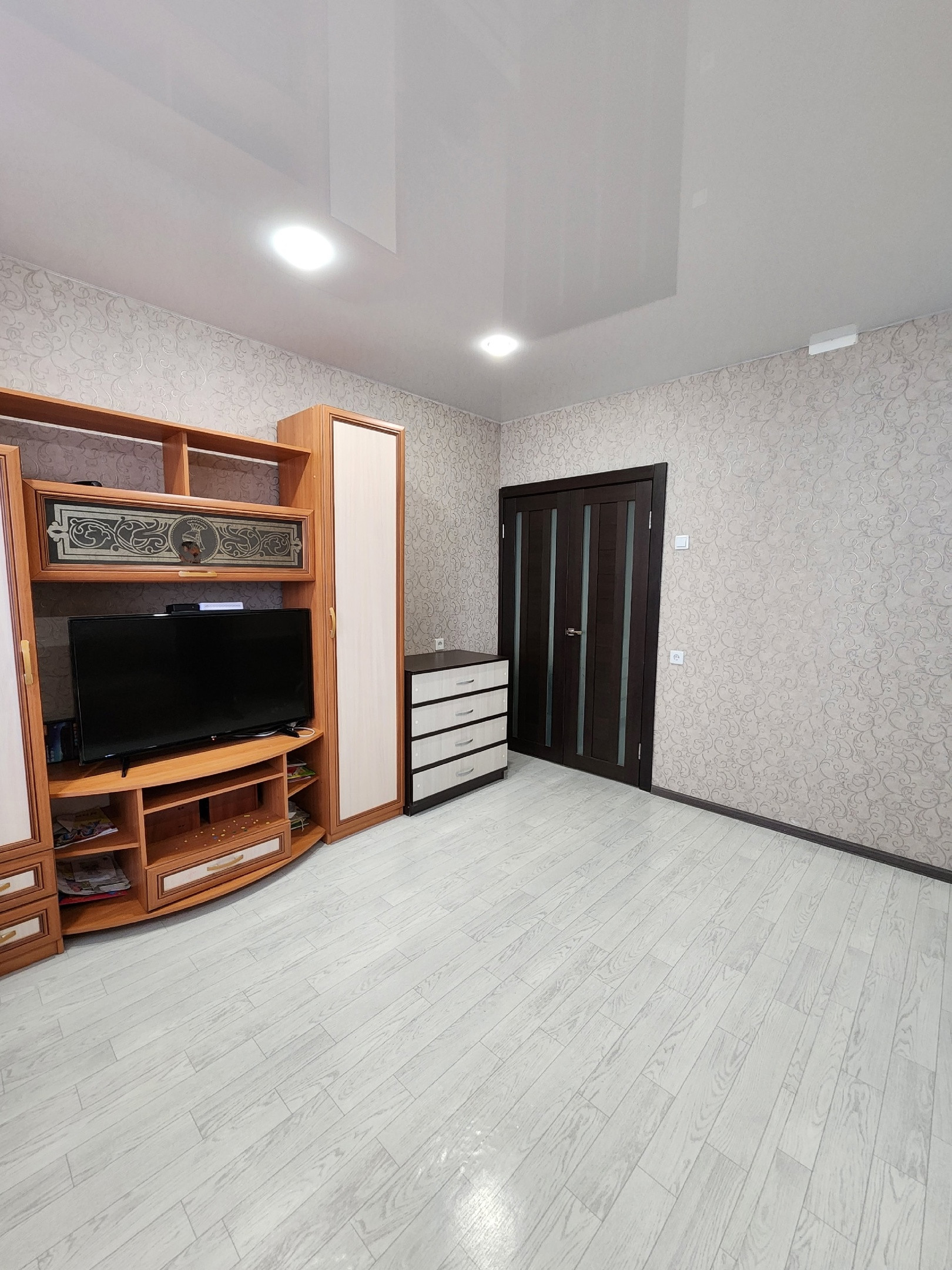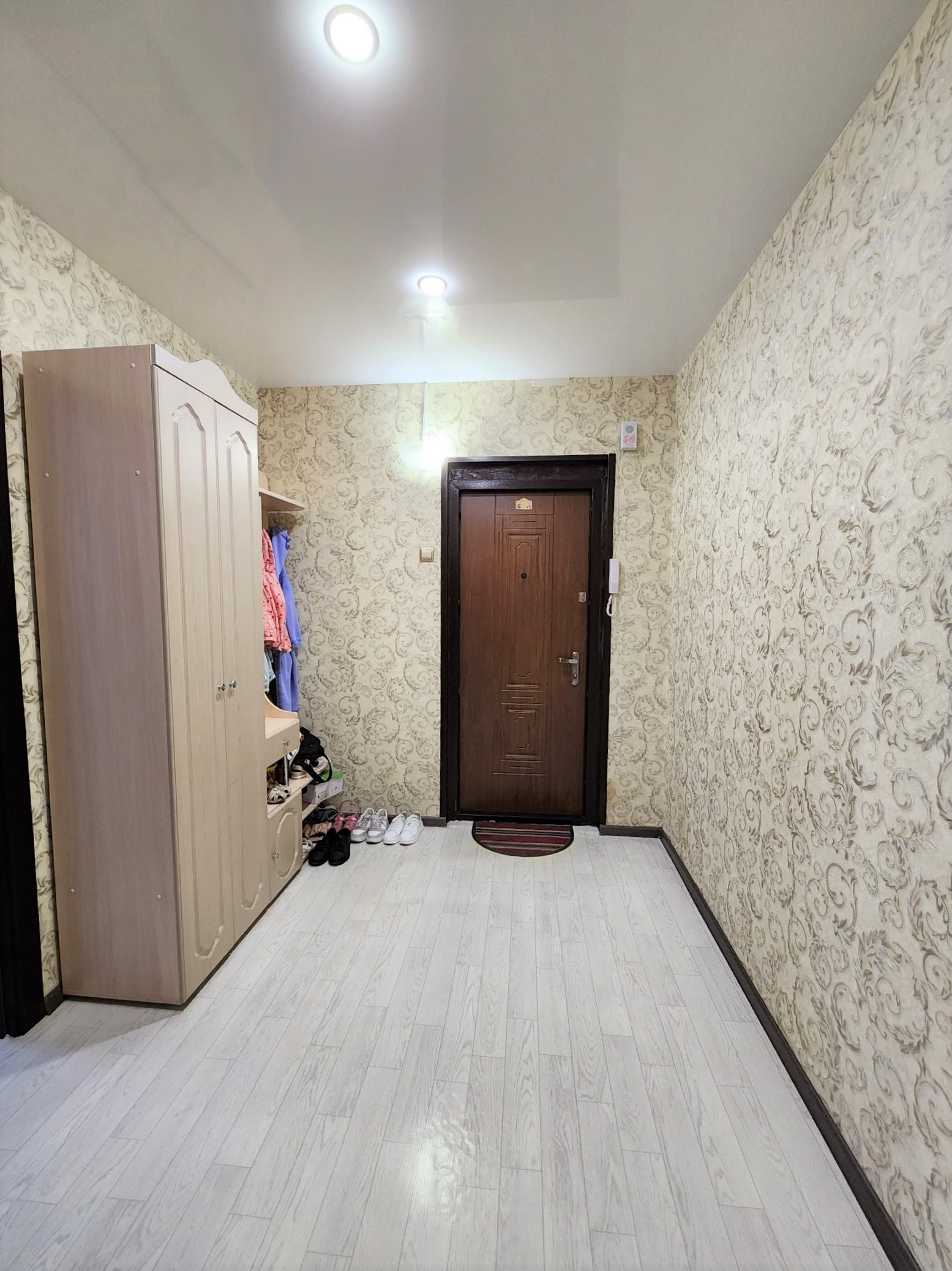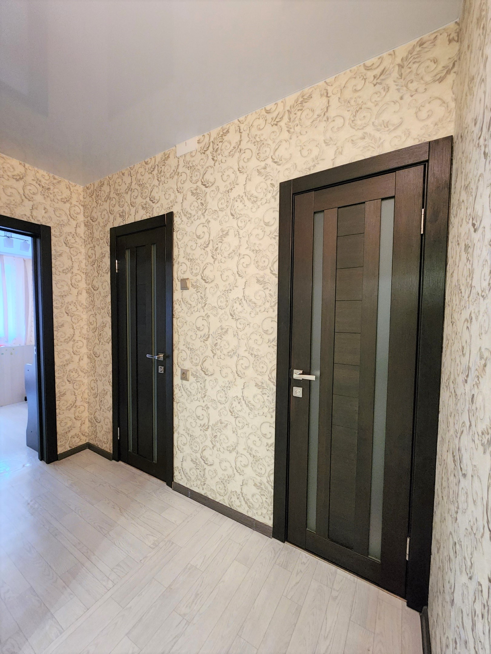 В квартире сделан ремонт. Наклеены современные обои. Двери в едином стиле. Установлены счетчики на воду.