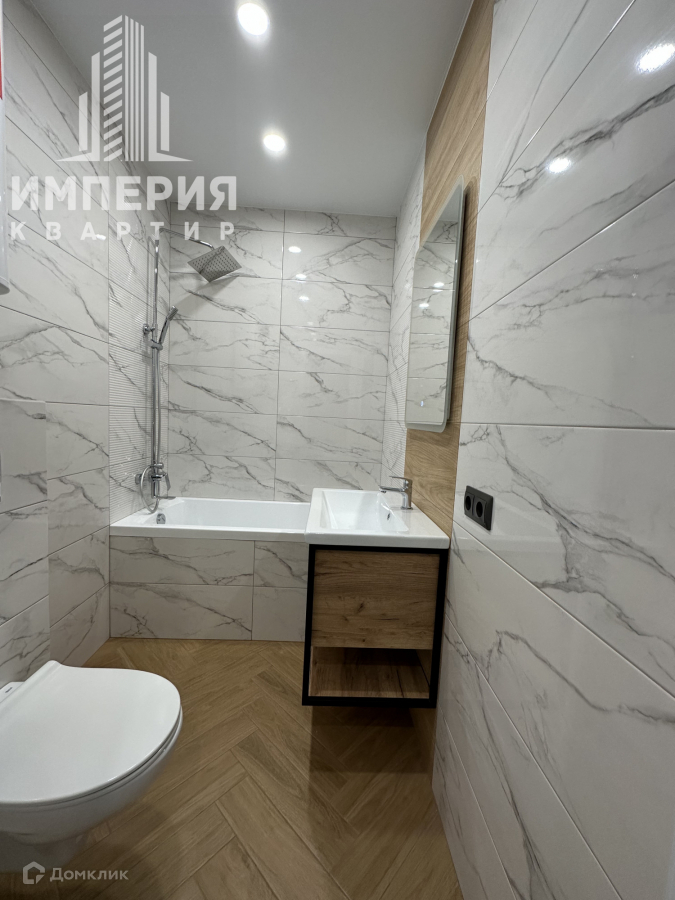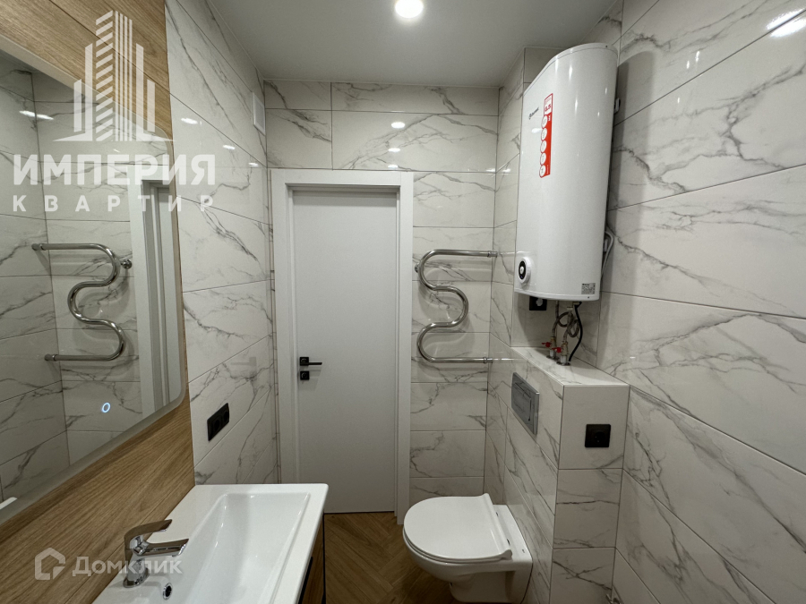 Сан узел отделан керамогранитом, инсталляция, тропический душ, установлен  водонагреватель, счетчики.