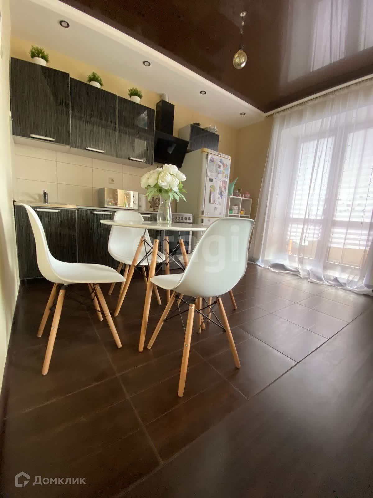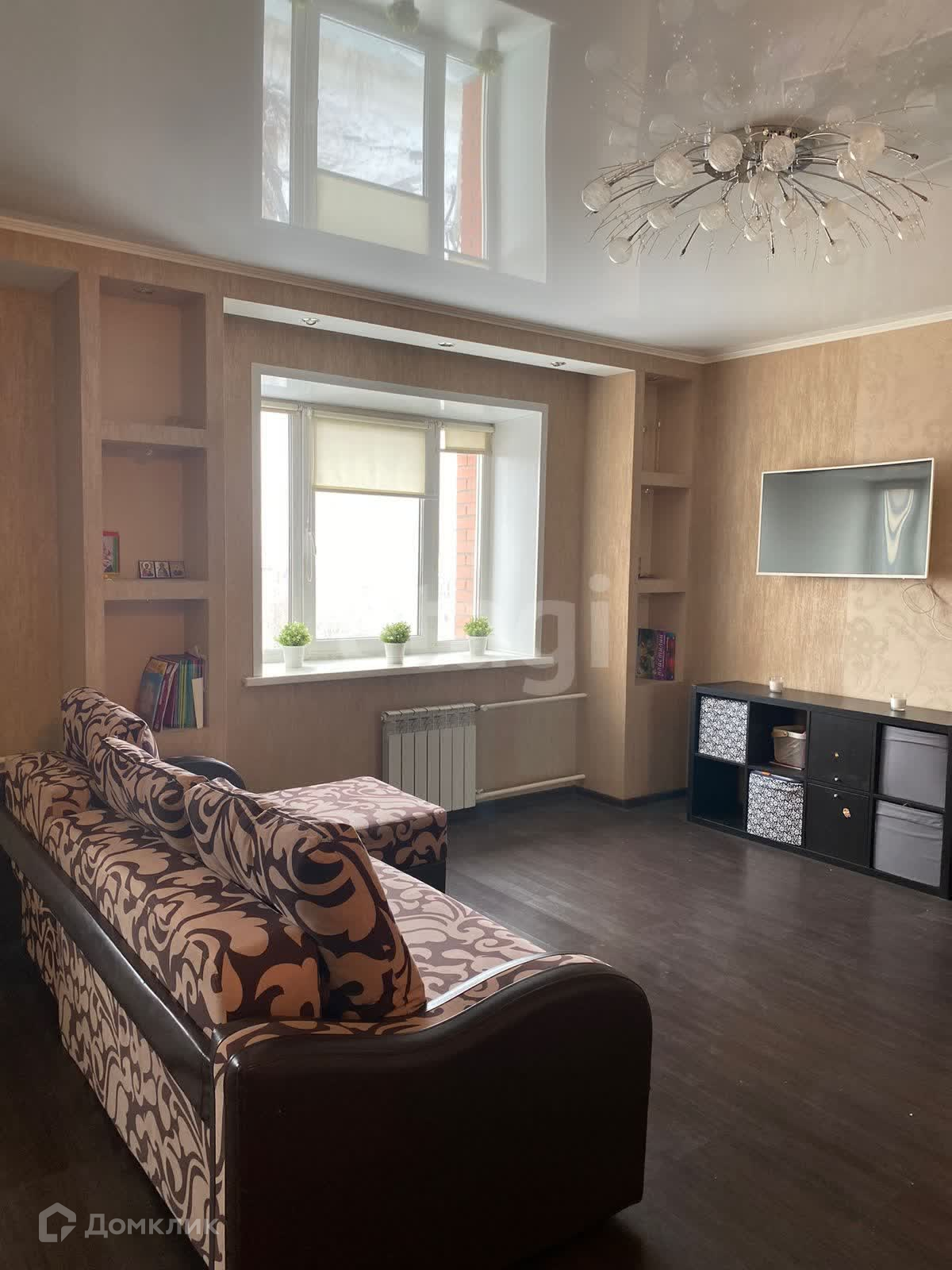 На кухне натяжной потолок, кухонный гарнитур оснащён всем необходимым. Санузел совмещенный, облицован кафелем. В коридоре и кухне на полу плитка, в комнате ламинат, на стенах обои в нейтральных тонах. Лоджия застелена. Встроенный шкаф под верхнюю одежду, дополнительно имеется отдельная очень вместительная гардеробная. Счётчики опломбированы, поверка проведена.