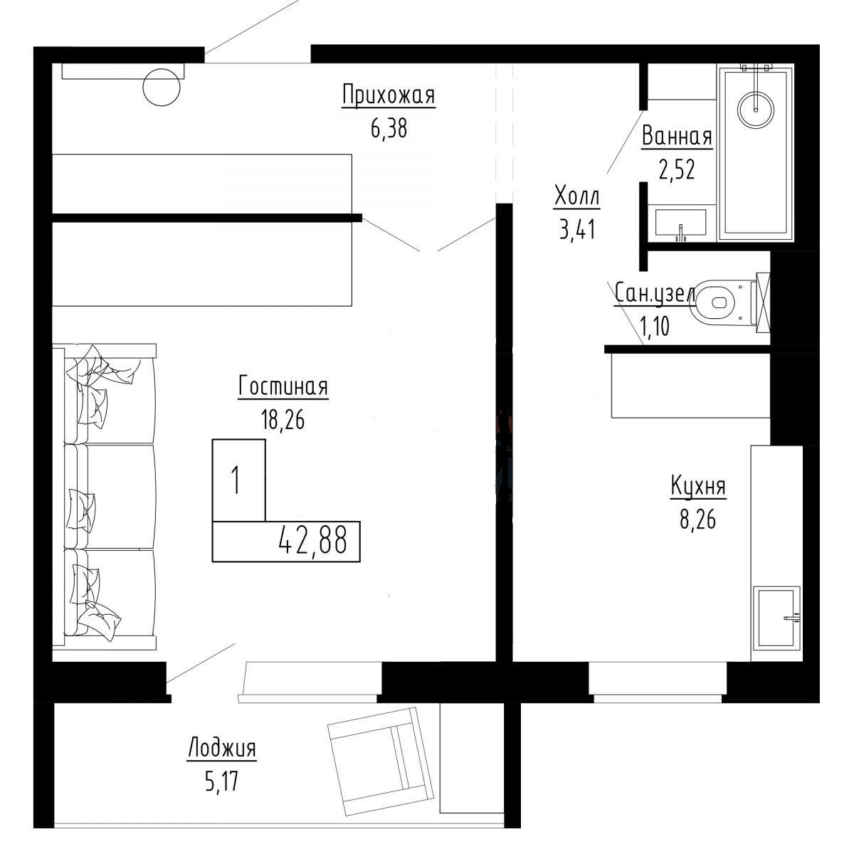Общая площадь 43 м2