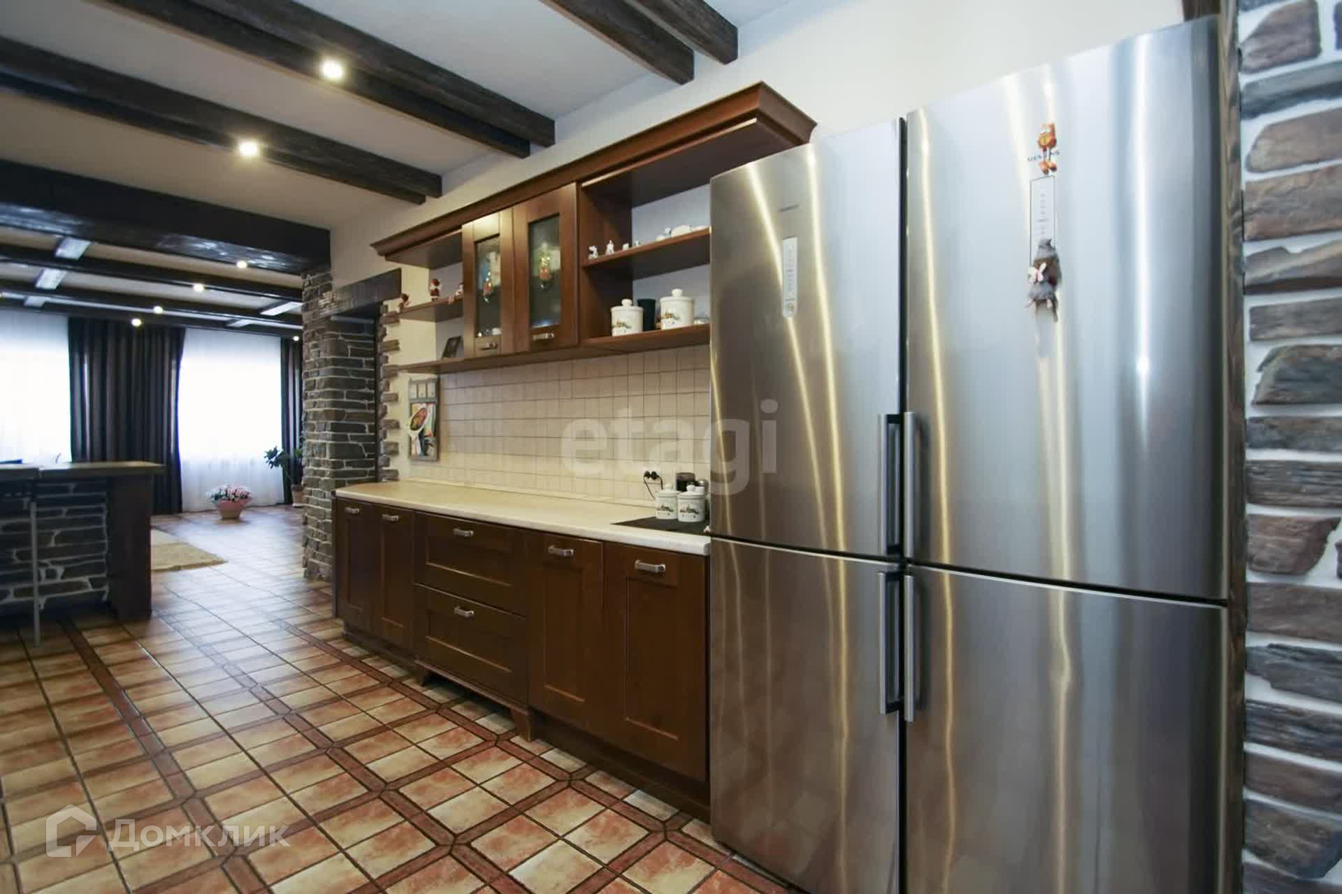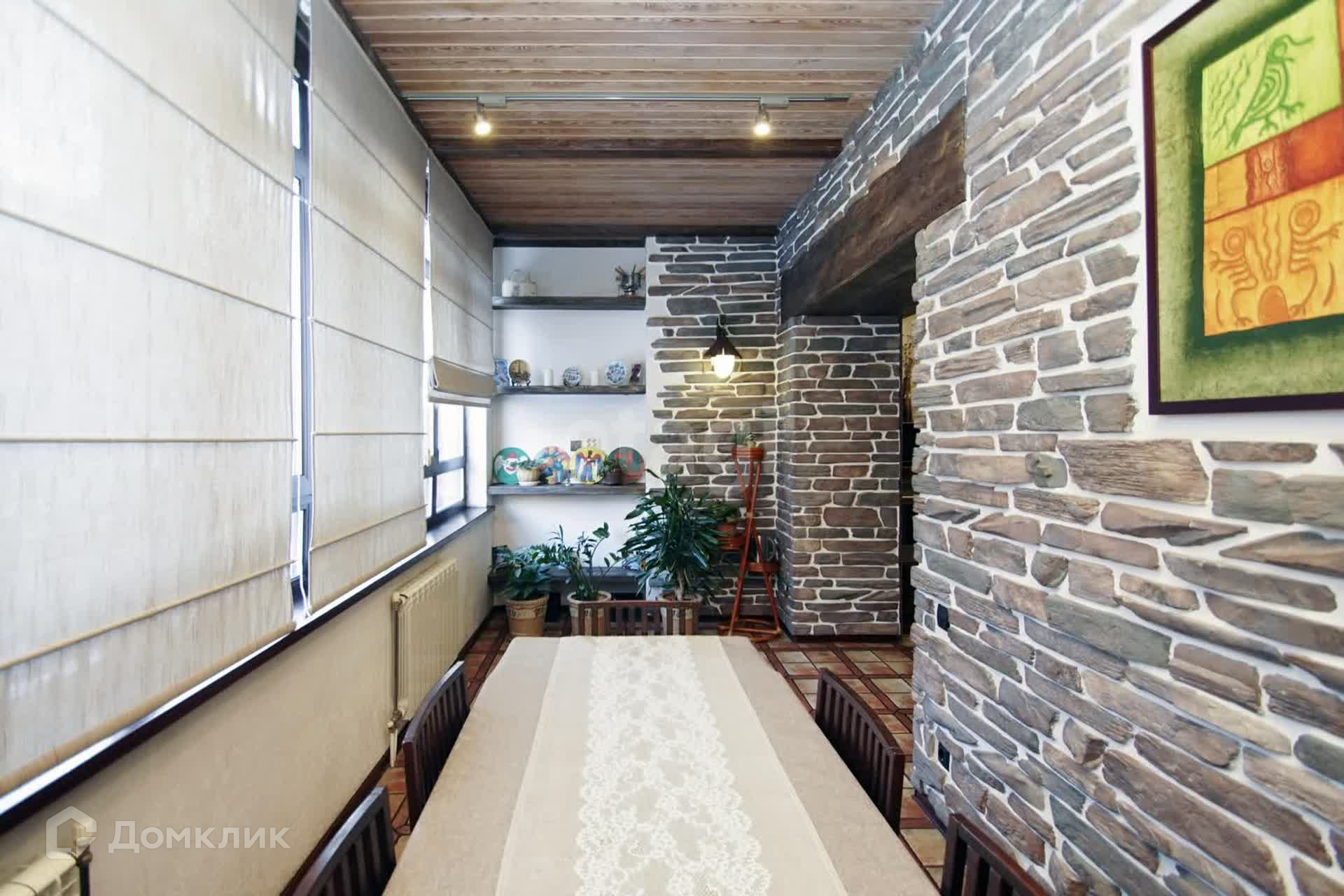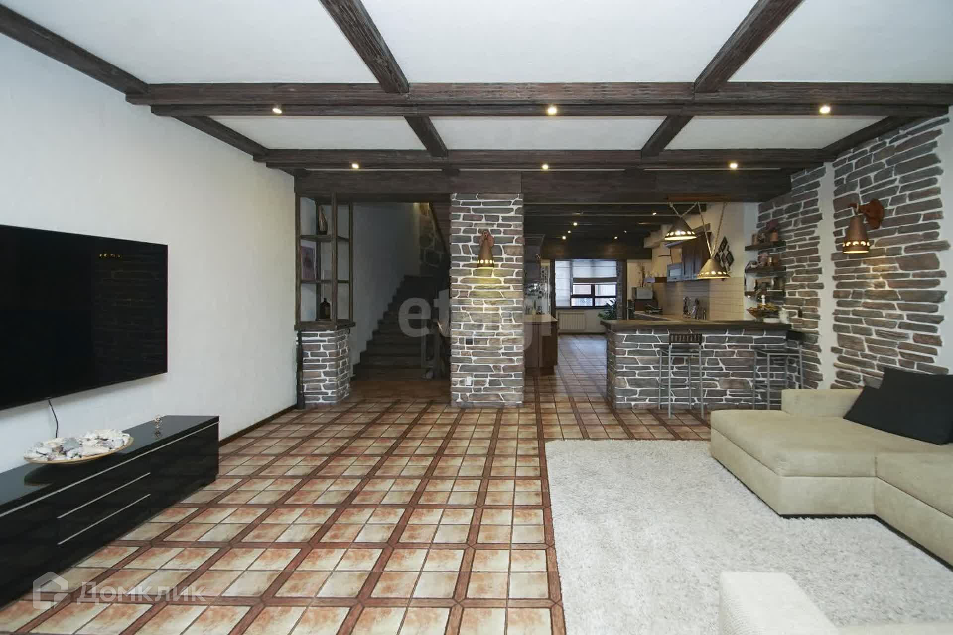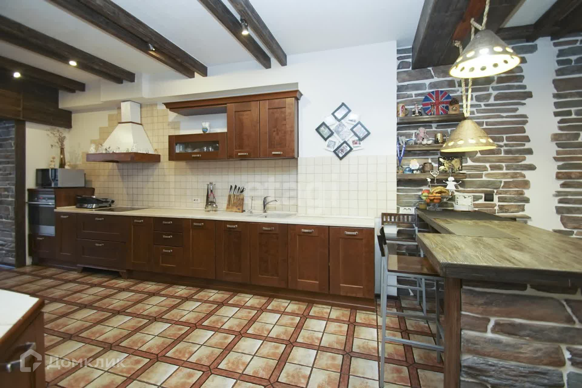 Второй этаж гостиная + кухня. Встроенный кухонный гарнитур из итальянского массива, кондиционер, бытовая техника. Стены- декоративная штукатурка, на потолке балки из брошированной и патенированной сосны. В доме три санузла. Вся сантехника немецкая.