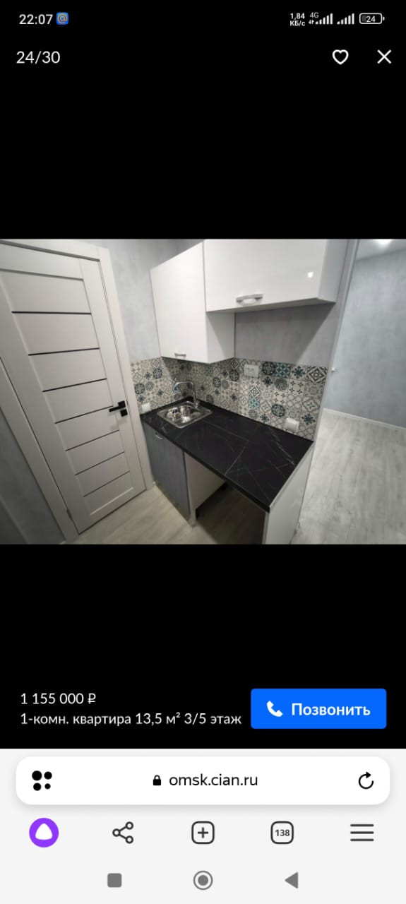 1-комнатная квартира, 17.9 м2, этаж 3 / 5, на продажу в Омске, 2-я Ленинградская улица, 22