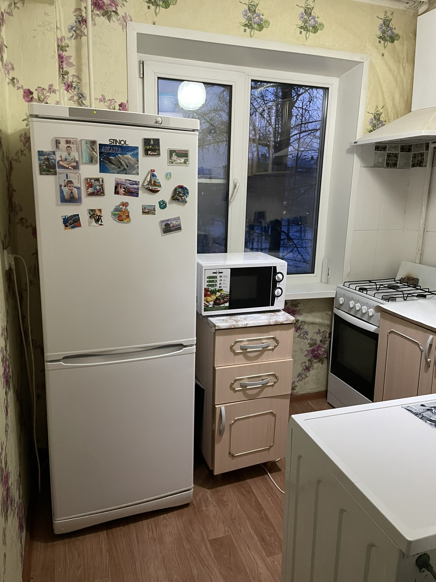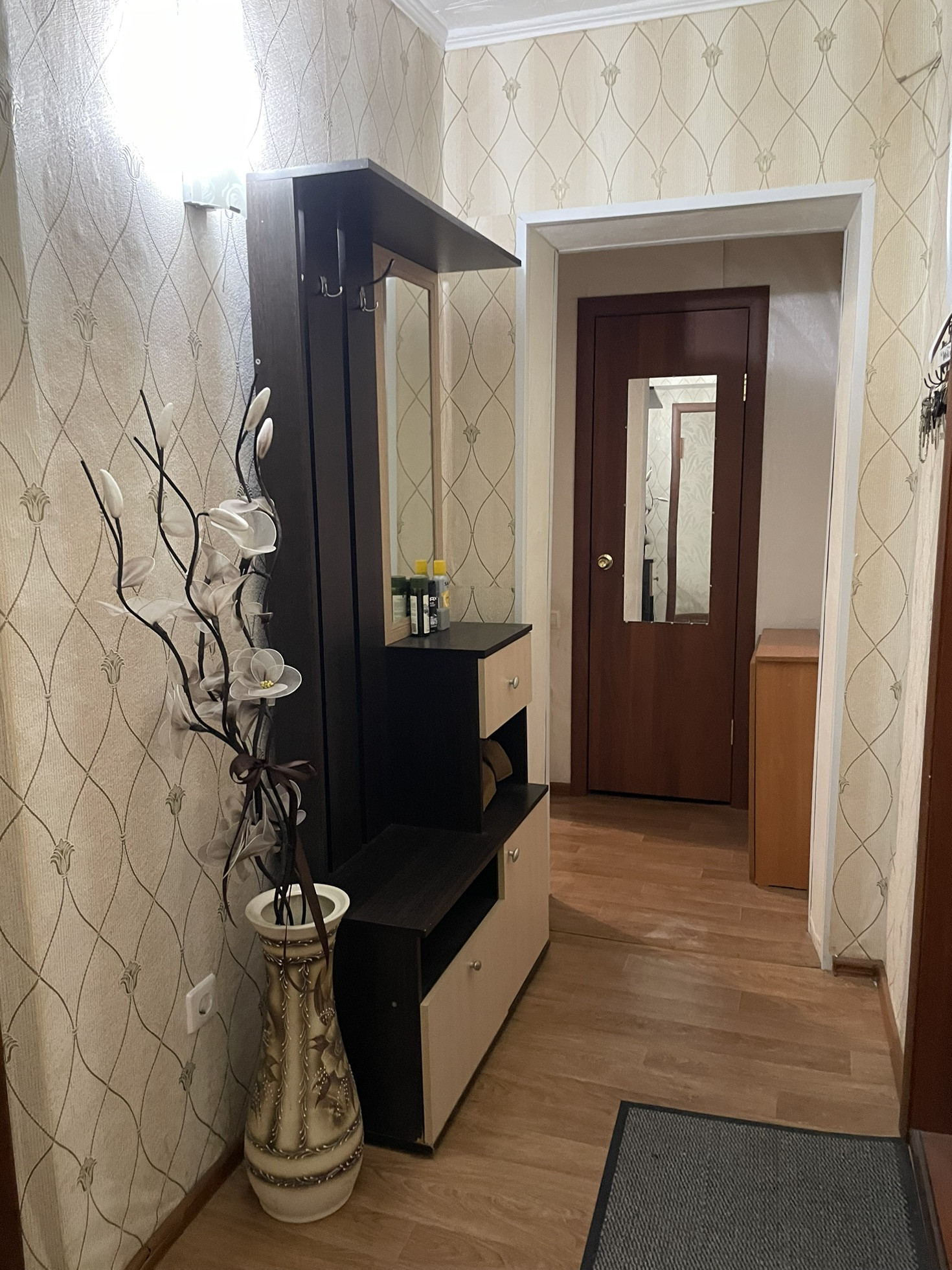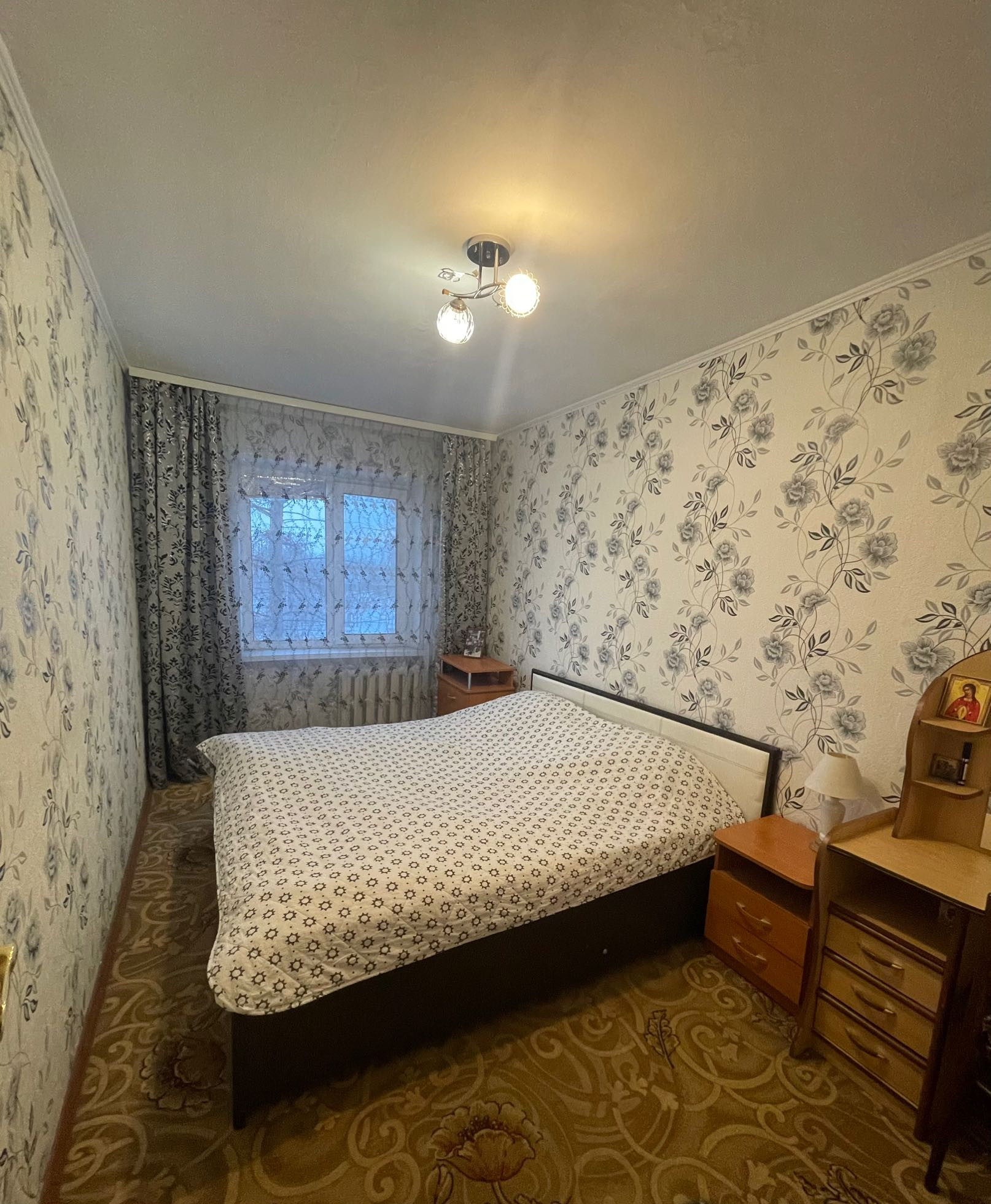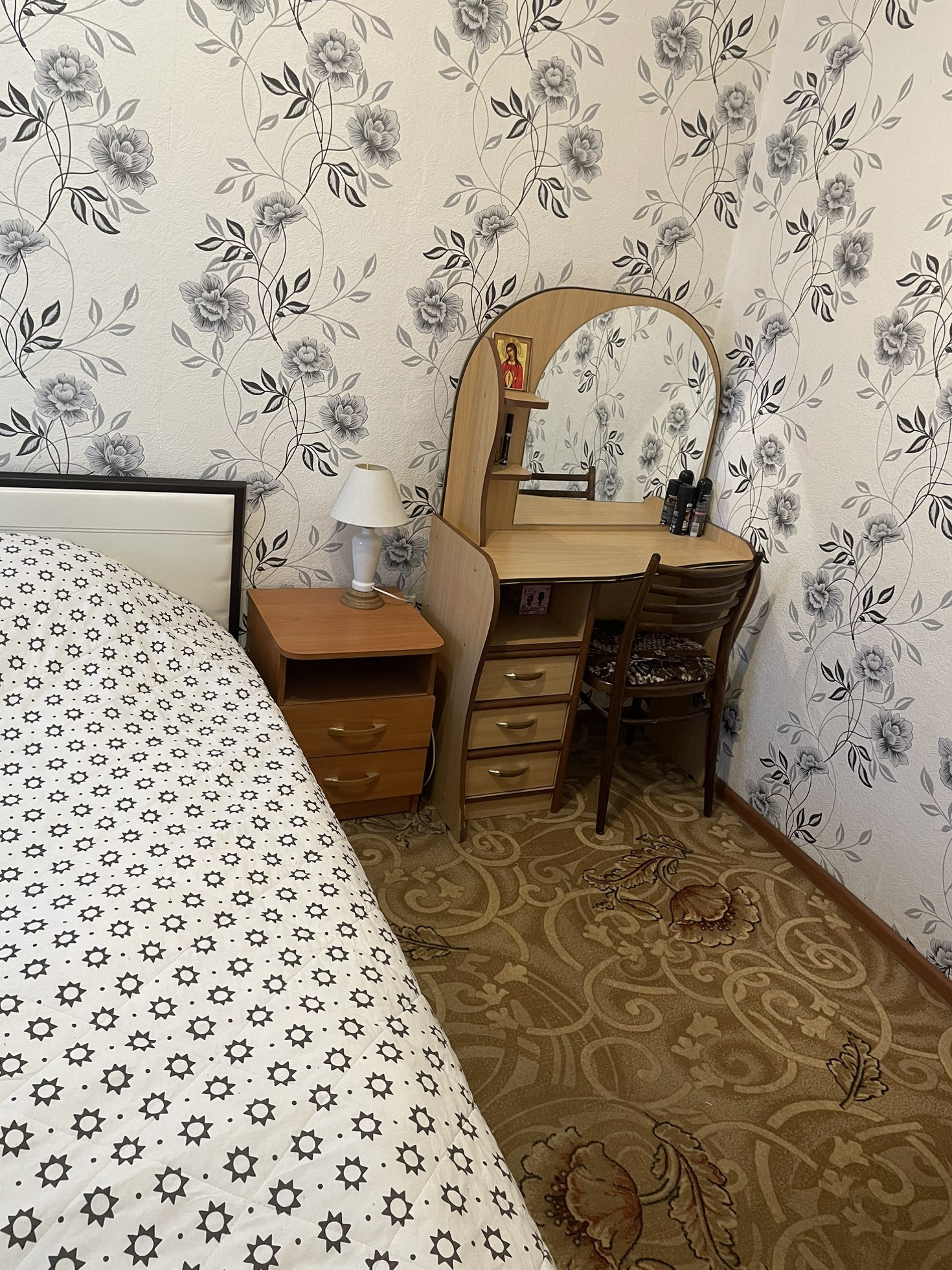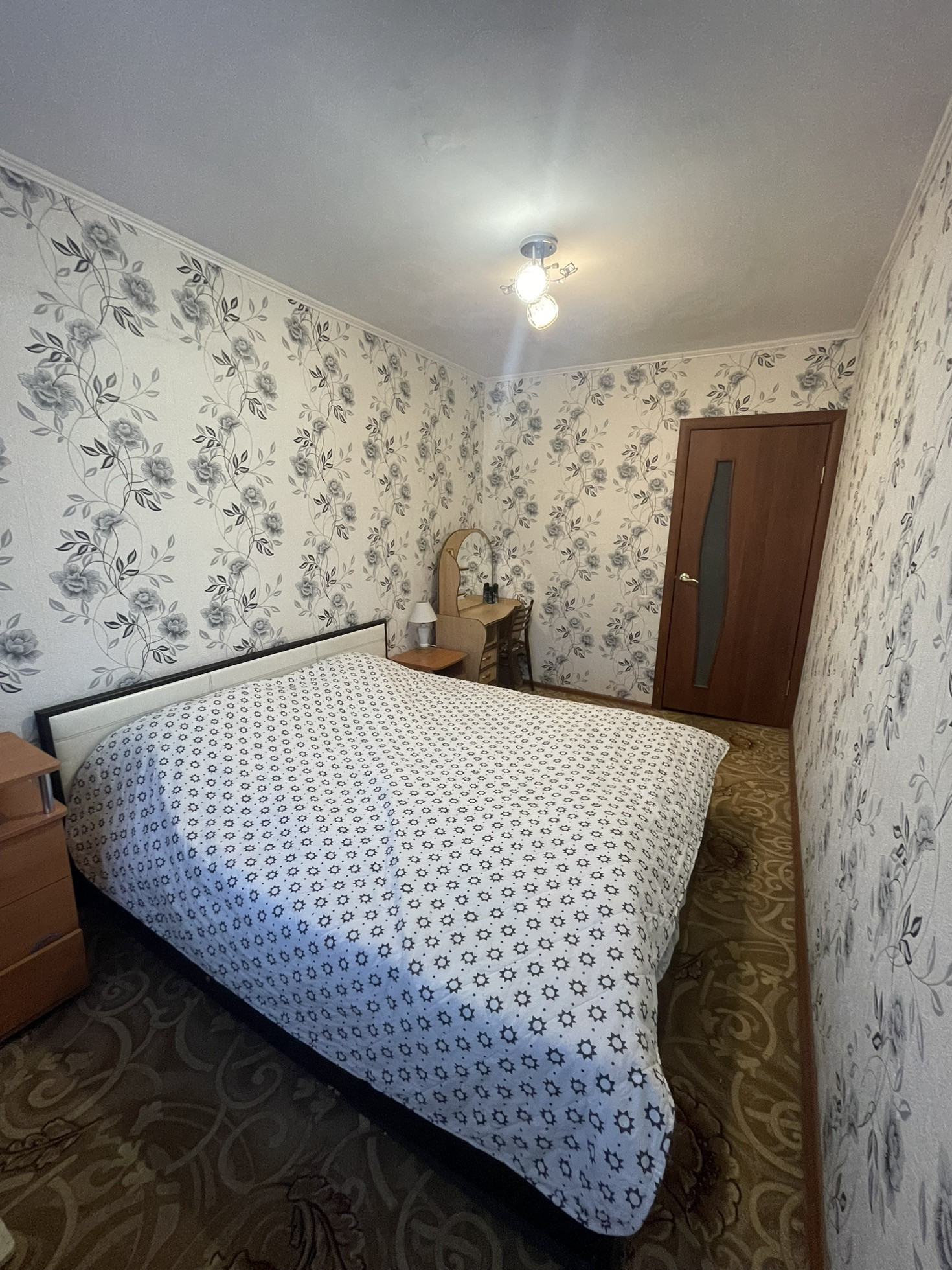 При продаже остаётся кухонный гарнитур, газовая плита, кровать, прикроватные тумбы, косметический стол, коридорный шкаф.