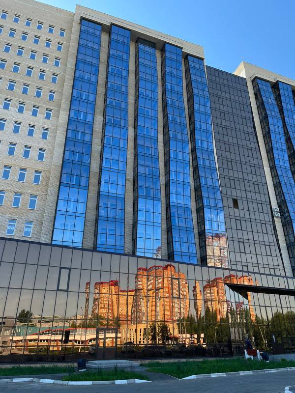 Авторский дизайн фасада с закаленным панорамным остеклением. Переплеты окон и витражей с наружной стороны, выполненные в «небесно-голубом» и цвете «шампань», имеют сложную контурную форму. Все архитектурные элементы в совокупности придают зданию грациозный ультрамодный внешний вид.