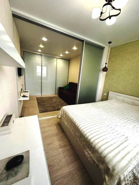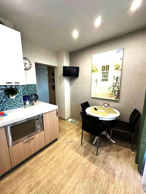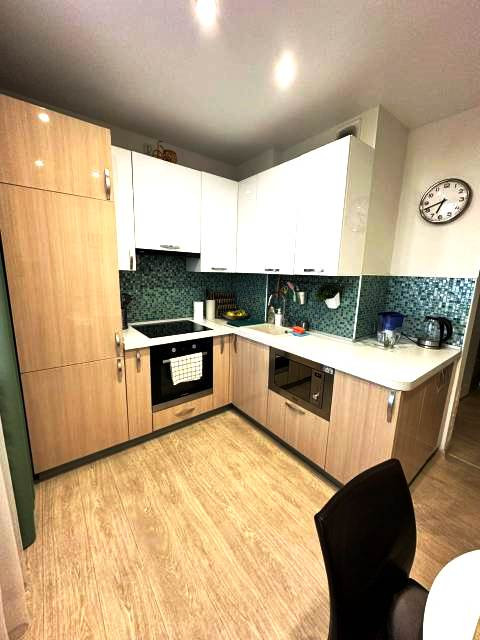Из просторной кухни выход на балкон. При продаже остается кухонный гарнитур со встроенной техникой  и вся мебель (кровать без матраса).