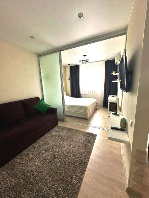 Жилая комната разделена на две зоны: гостиную и для сна.