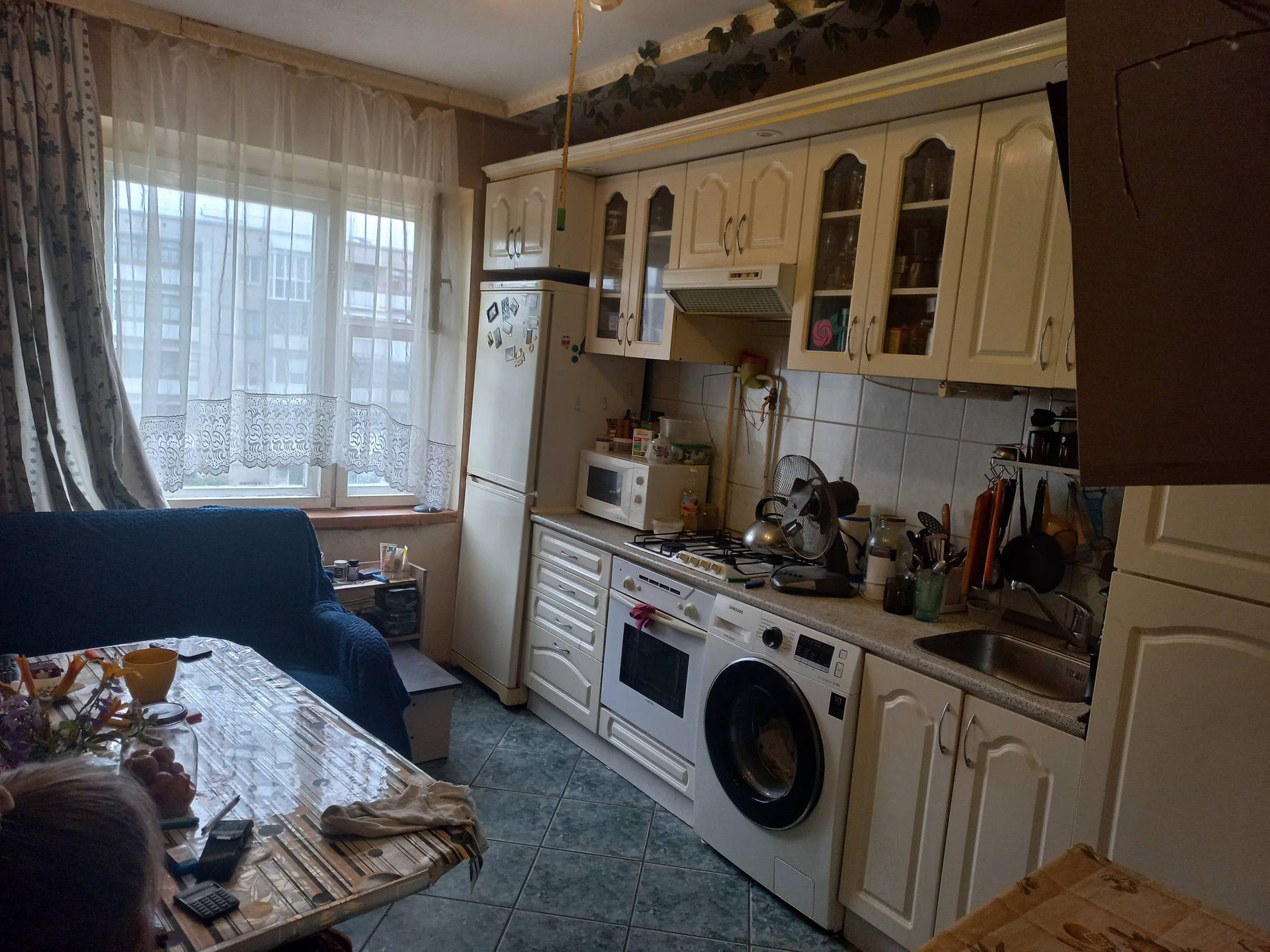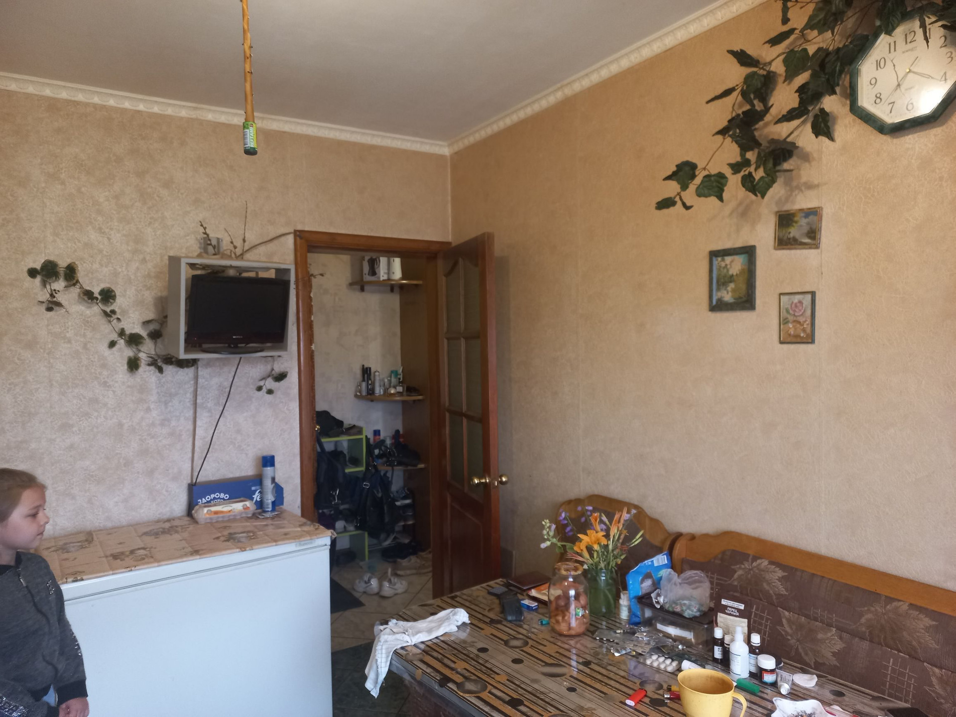 В кухне сделана перепланировка, узаконенная, увеличена площадь. На полу в коридоре и на кухне кафель. Межкомнатные двери цвета дуб, как и шкаф-купе.