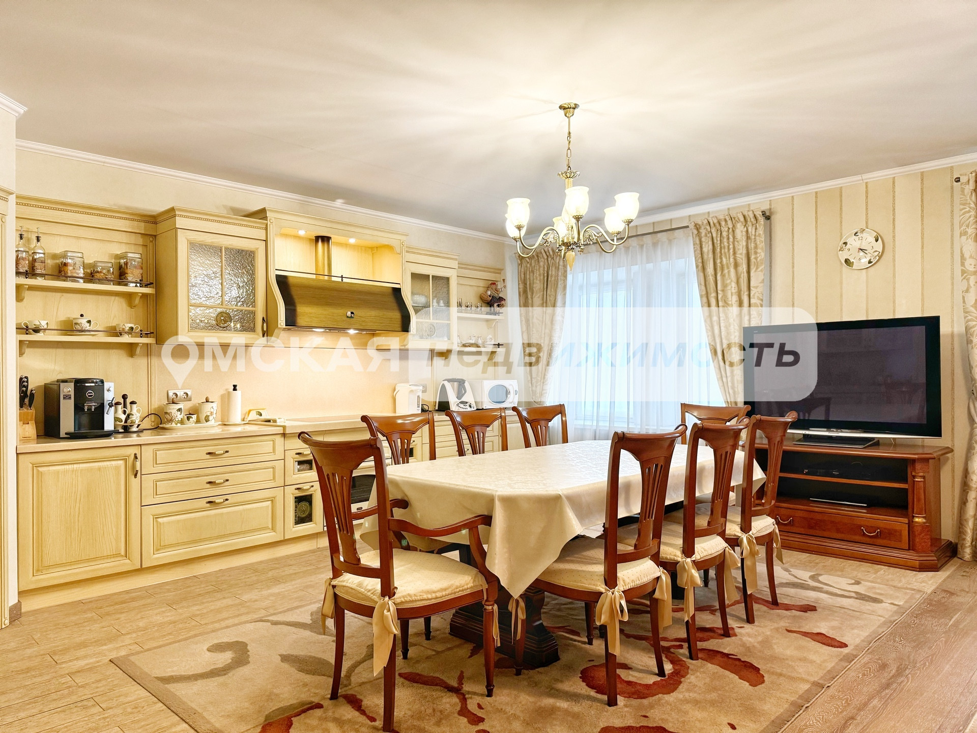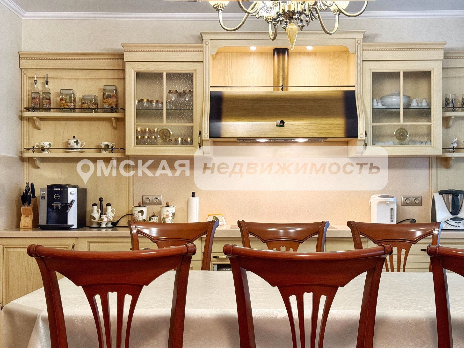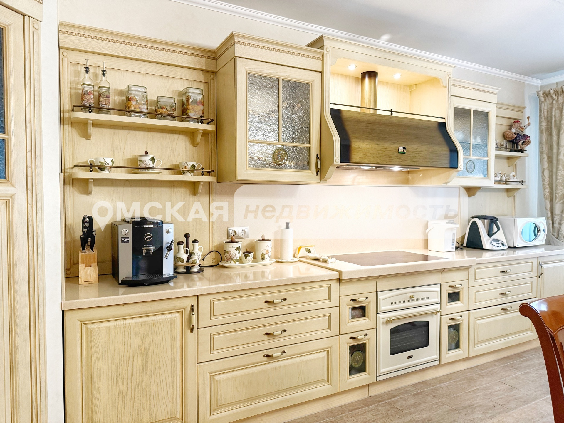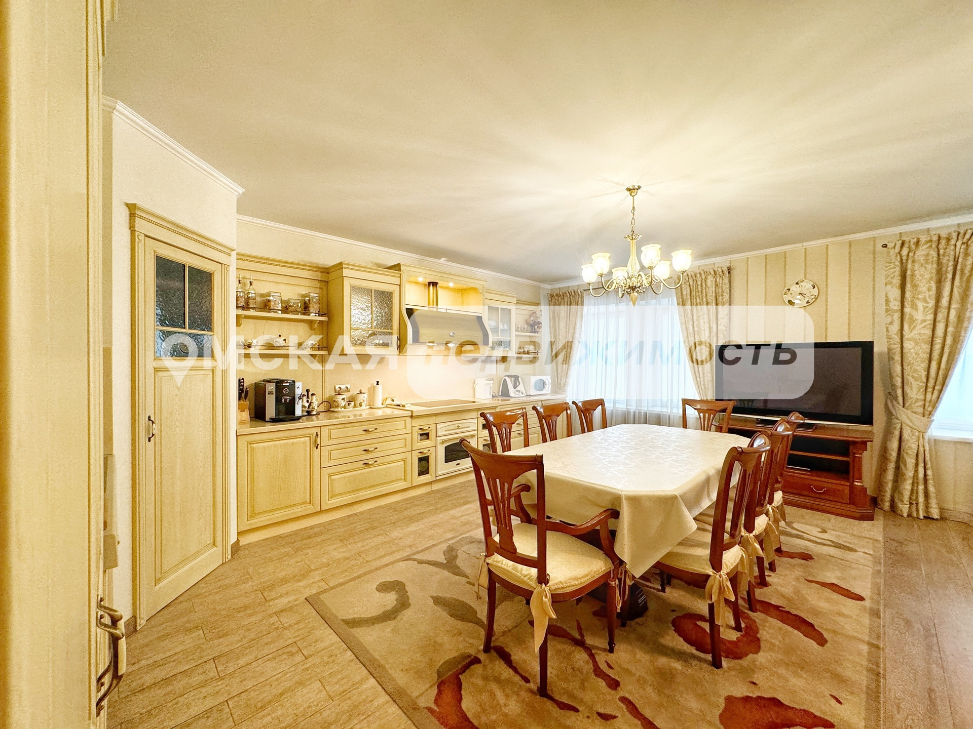 Установлен итальянский кухонный гарнитур из массива дерева, укомплектованный встроенной техникой (Два холодильника, Варочная поверхность, Духовой шкаф, ПСМ). Качественно обустроены системы хранения и гардеробы.