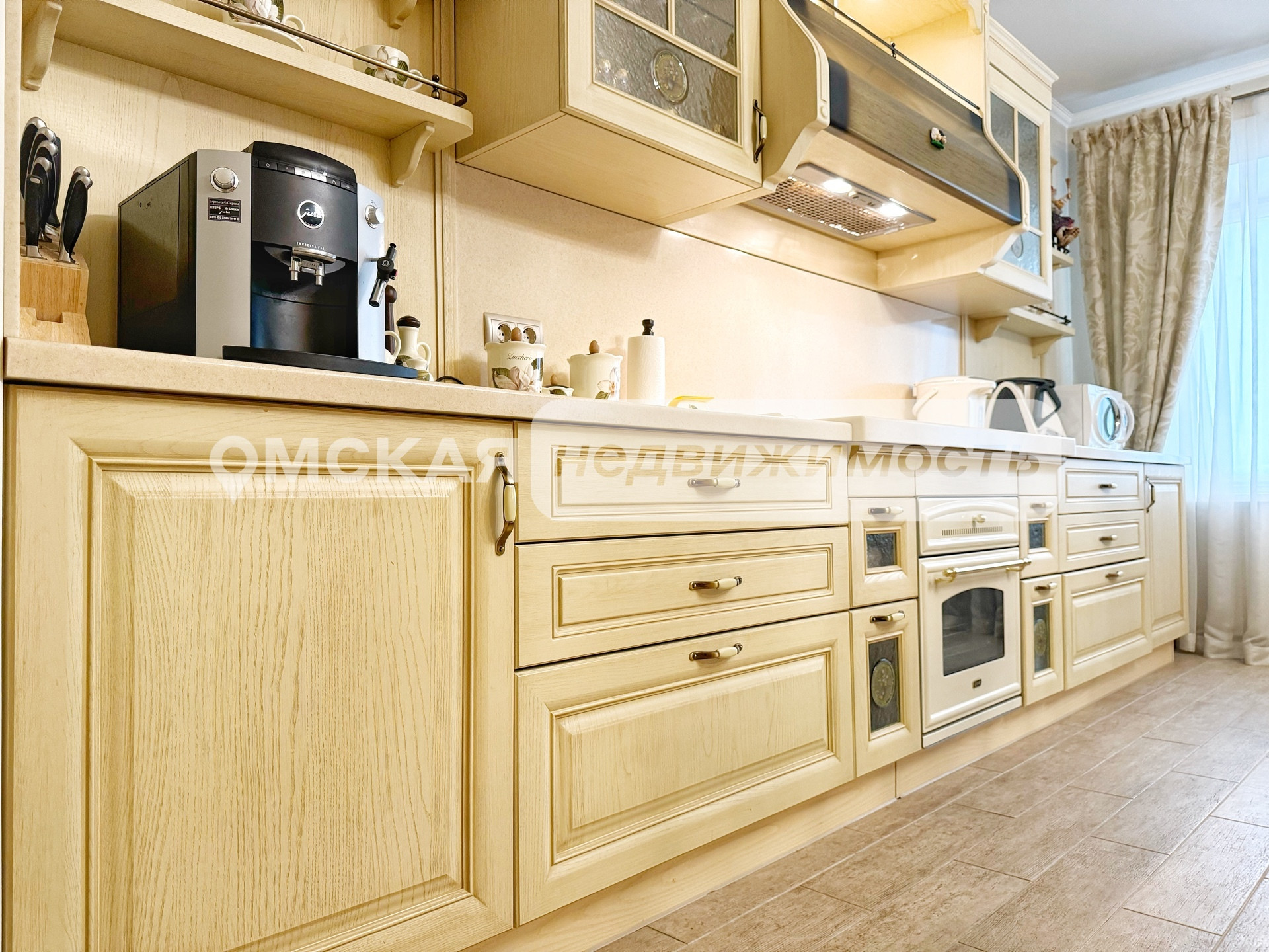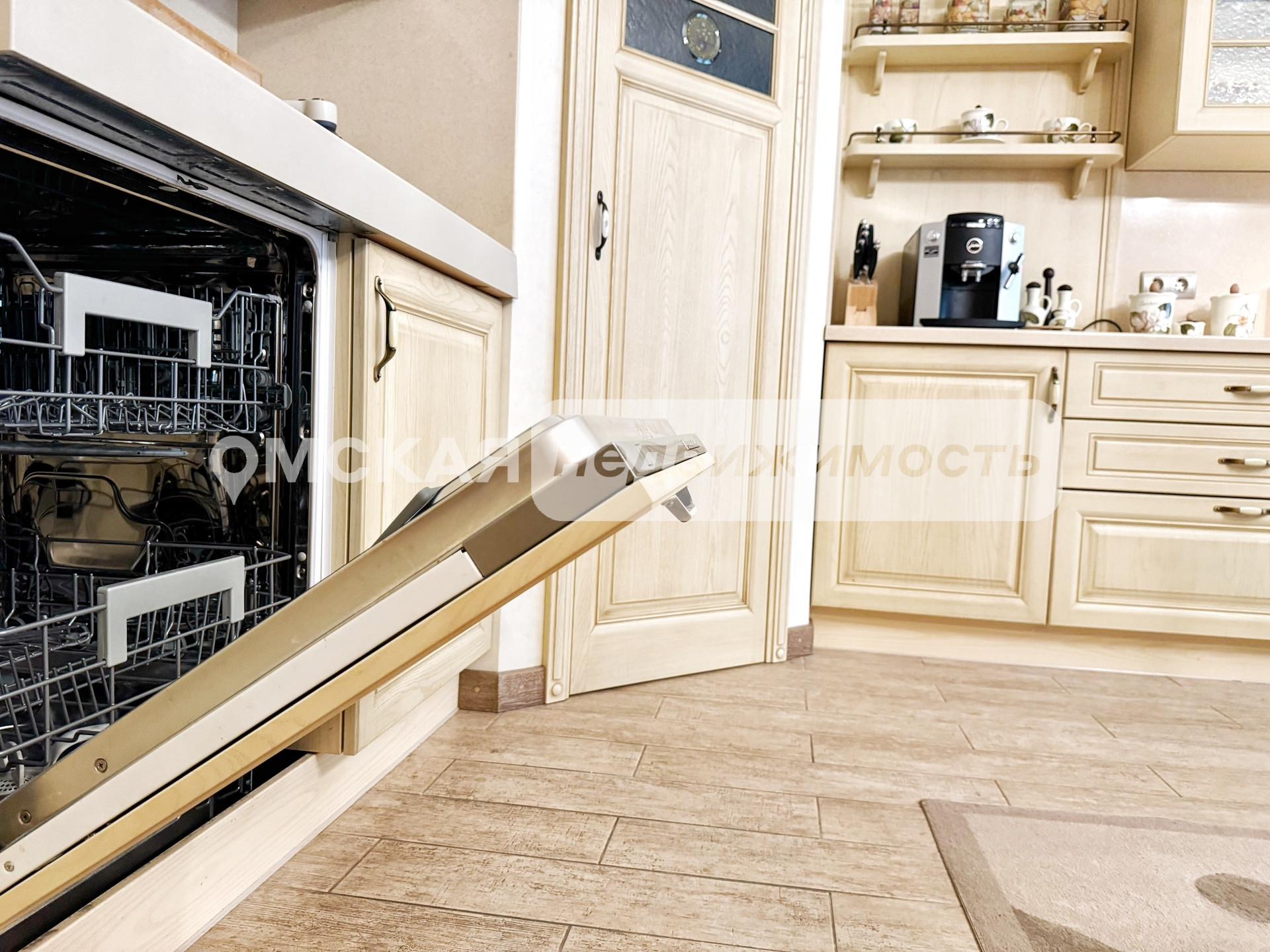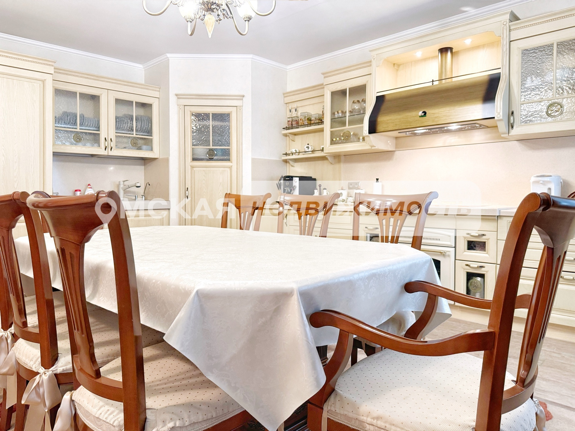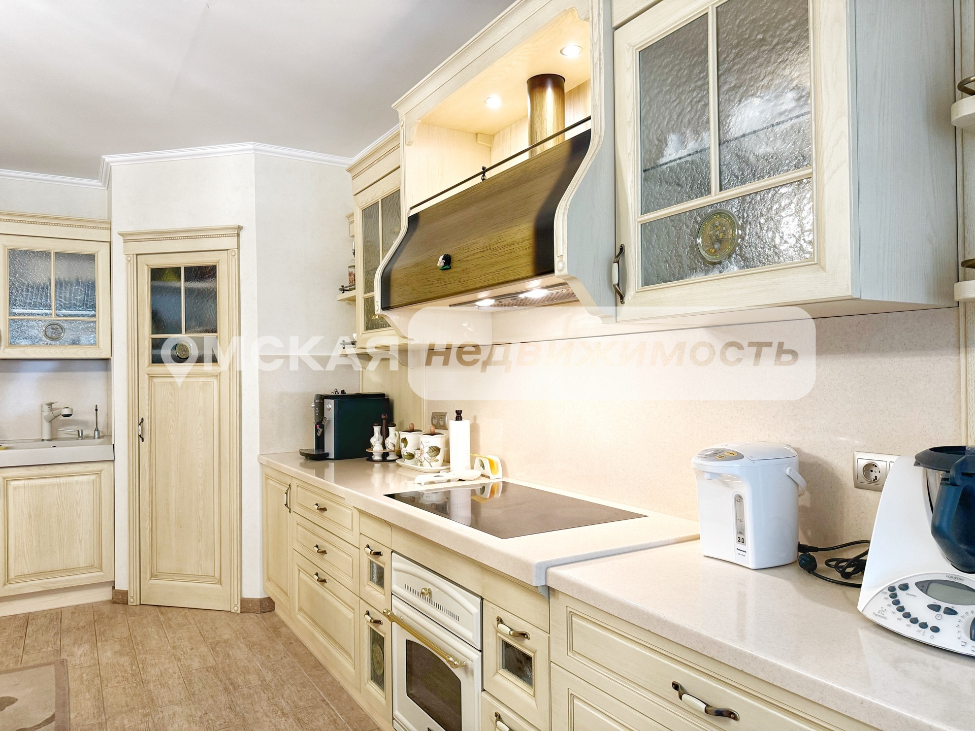 Установлен итальянский кухонный гарнитур из массива дерева, укомплектованный встроенной техникой (Два холодильника, Варочная поверхность, Духовой шкаф, ПСМ). Качественно обустроены системы хранения и гардеробы.