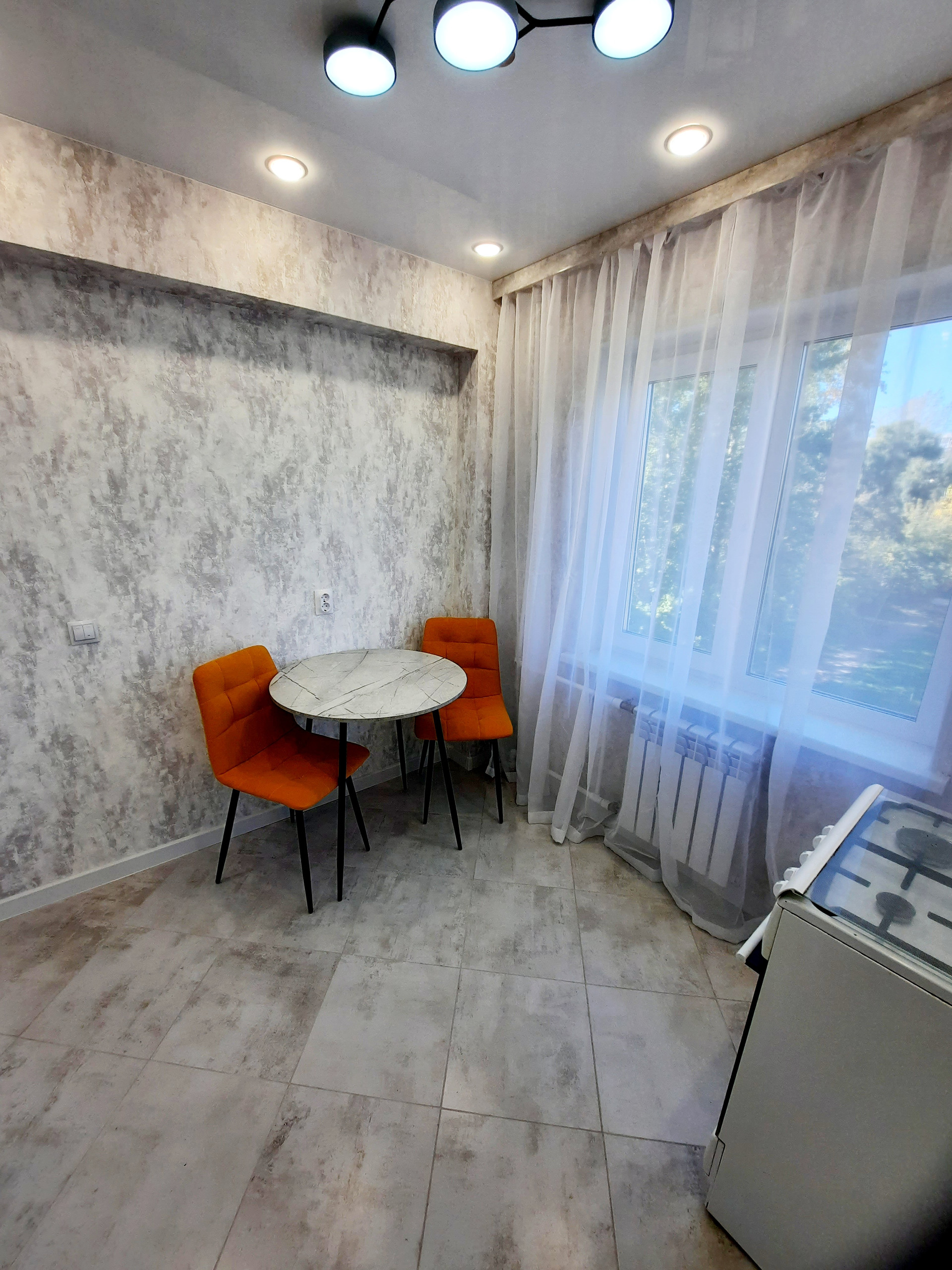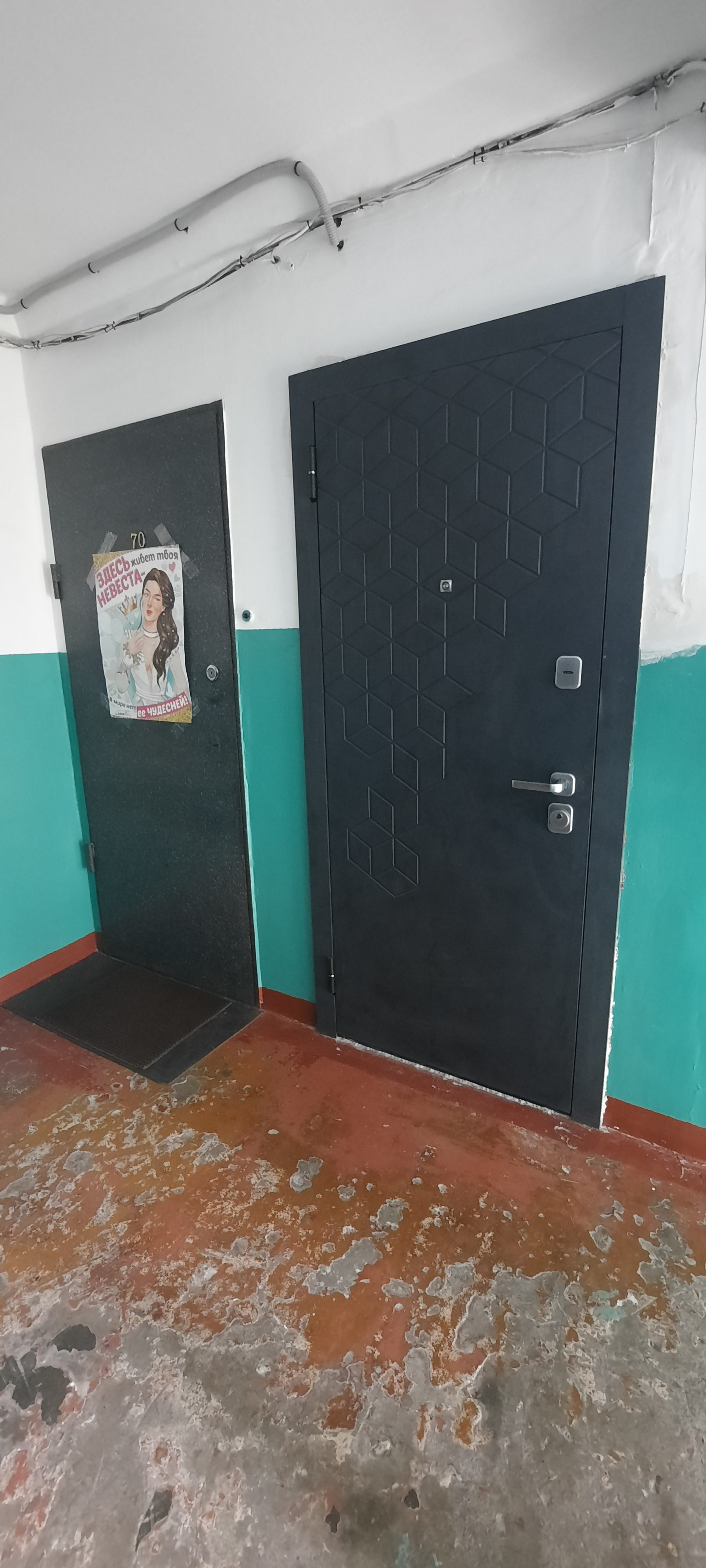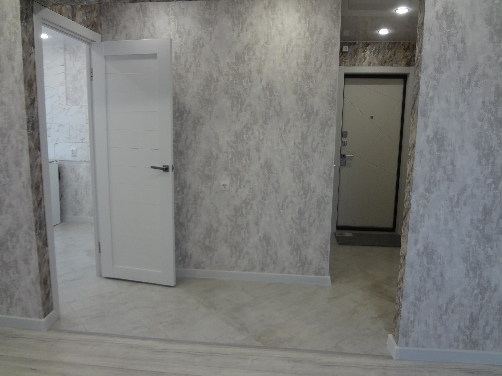 Выровнены и залиты новой стяжкой полы с покрытием керамогранит и линолиум Таrkеt. Новая входная металлическая дверь премиум класса. Натяжные потолки с обширной системой света.