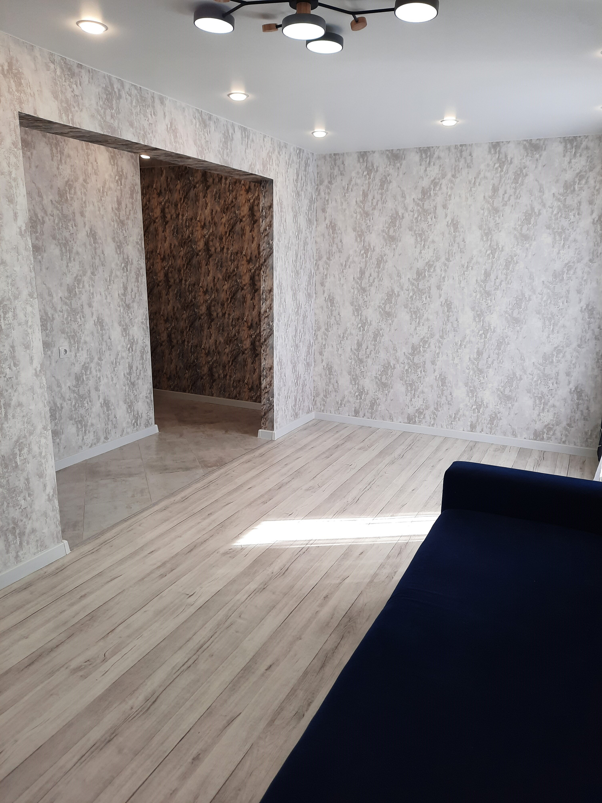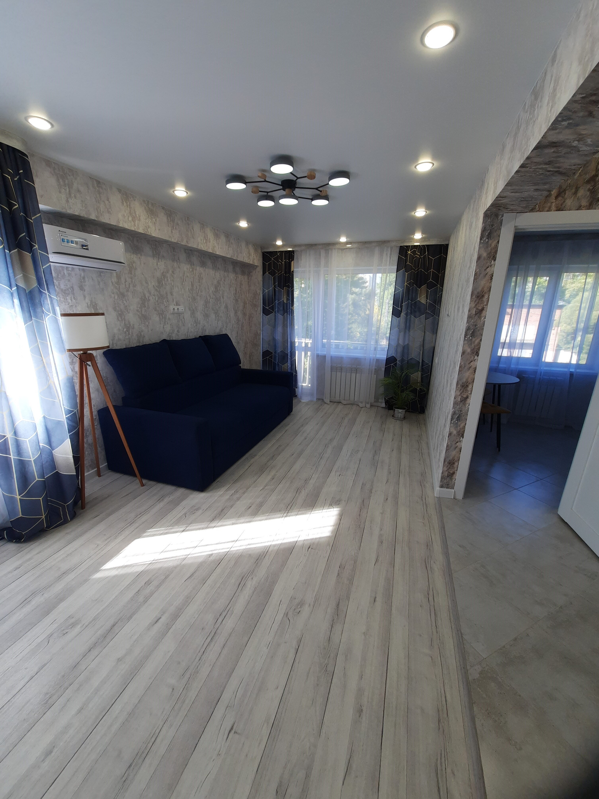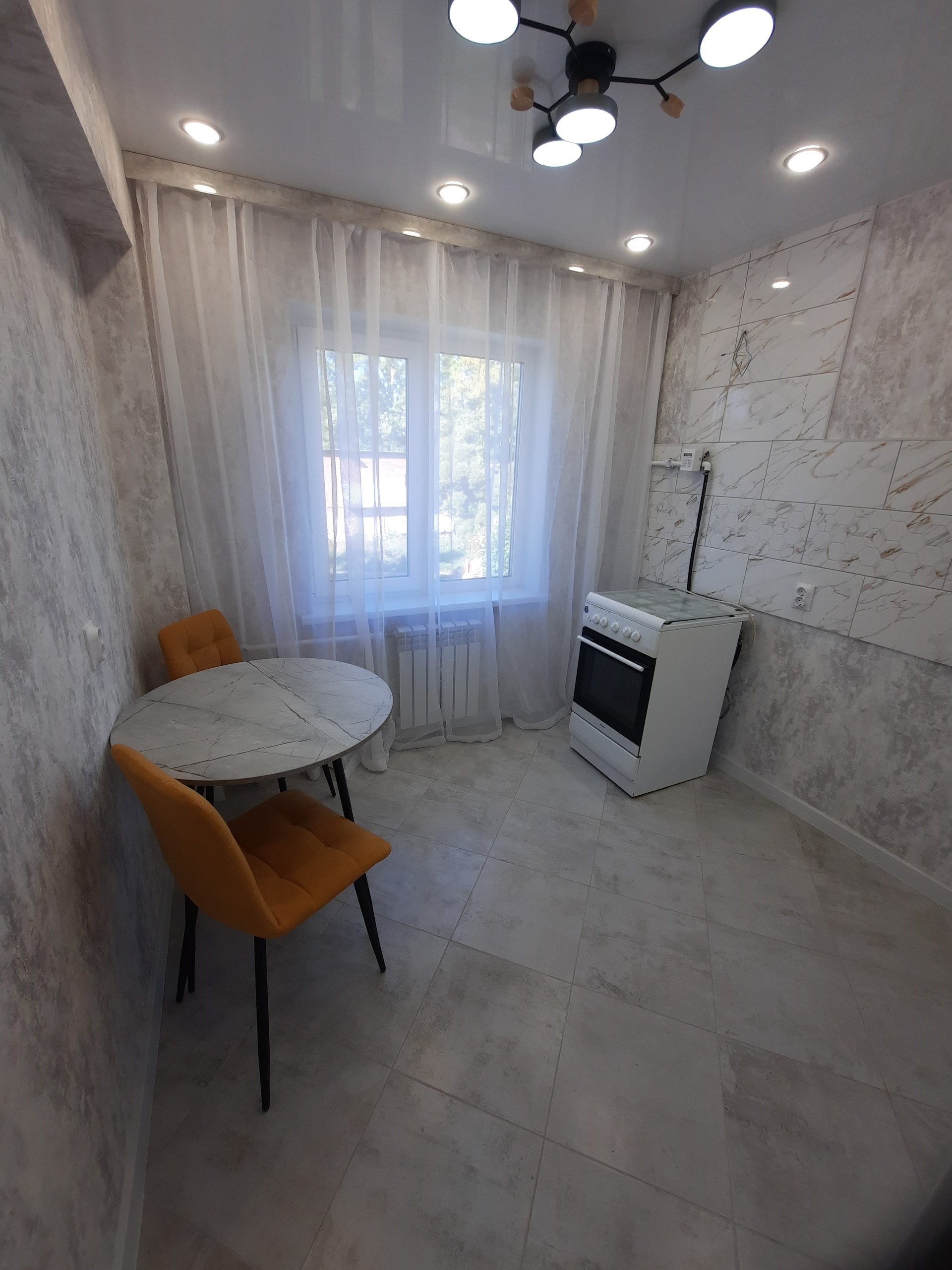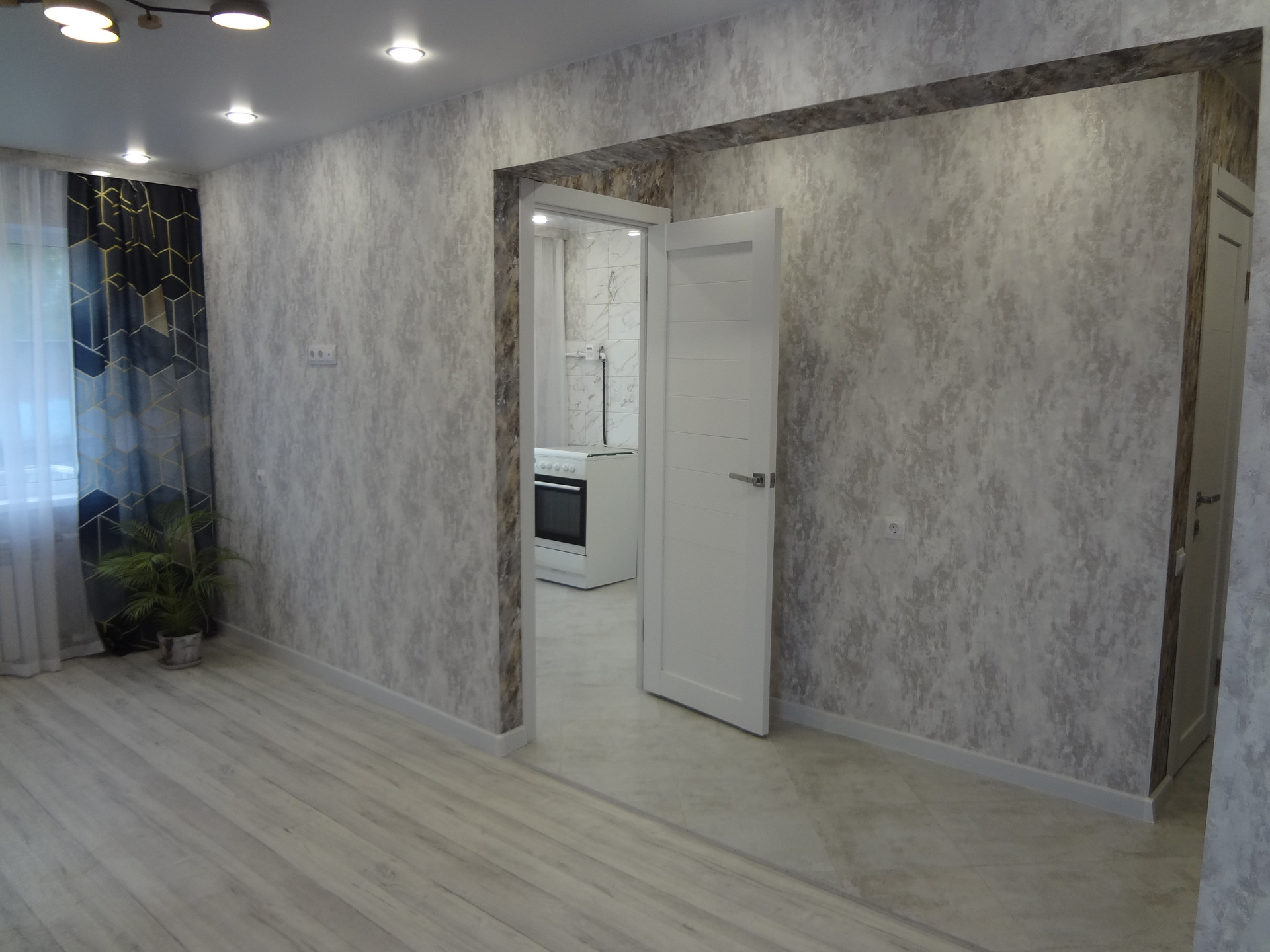 Выровнены и залиты новой стяжкой полы с покрытием керамогранит и линолиум Таrkеt. Новая входная металлическая дверь премиум класса. Натяжные потолки с обширной системой света.