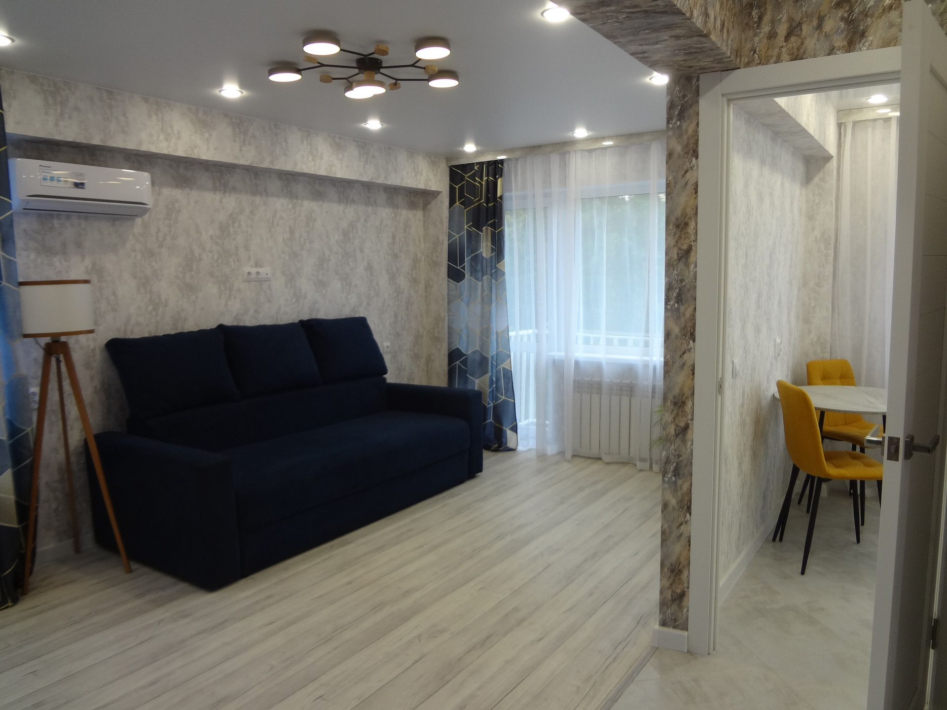 Остаётся диван в стиле лофт, обеденная зона.