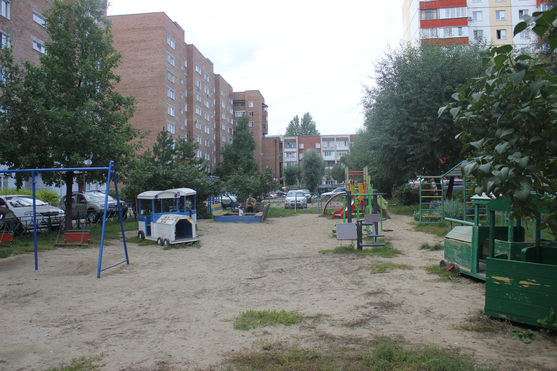 Во дворе парковка, современная детская площадка.