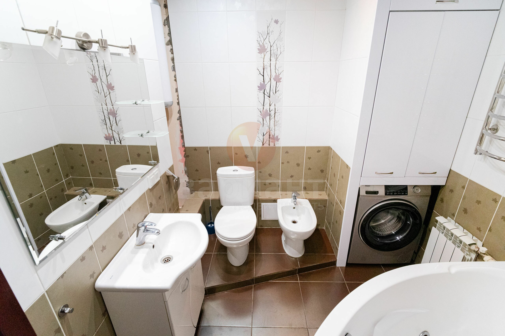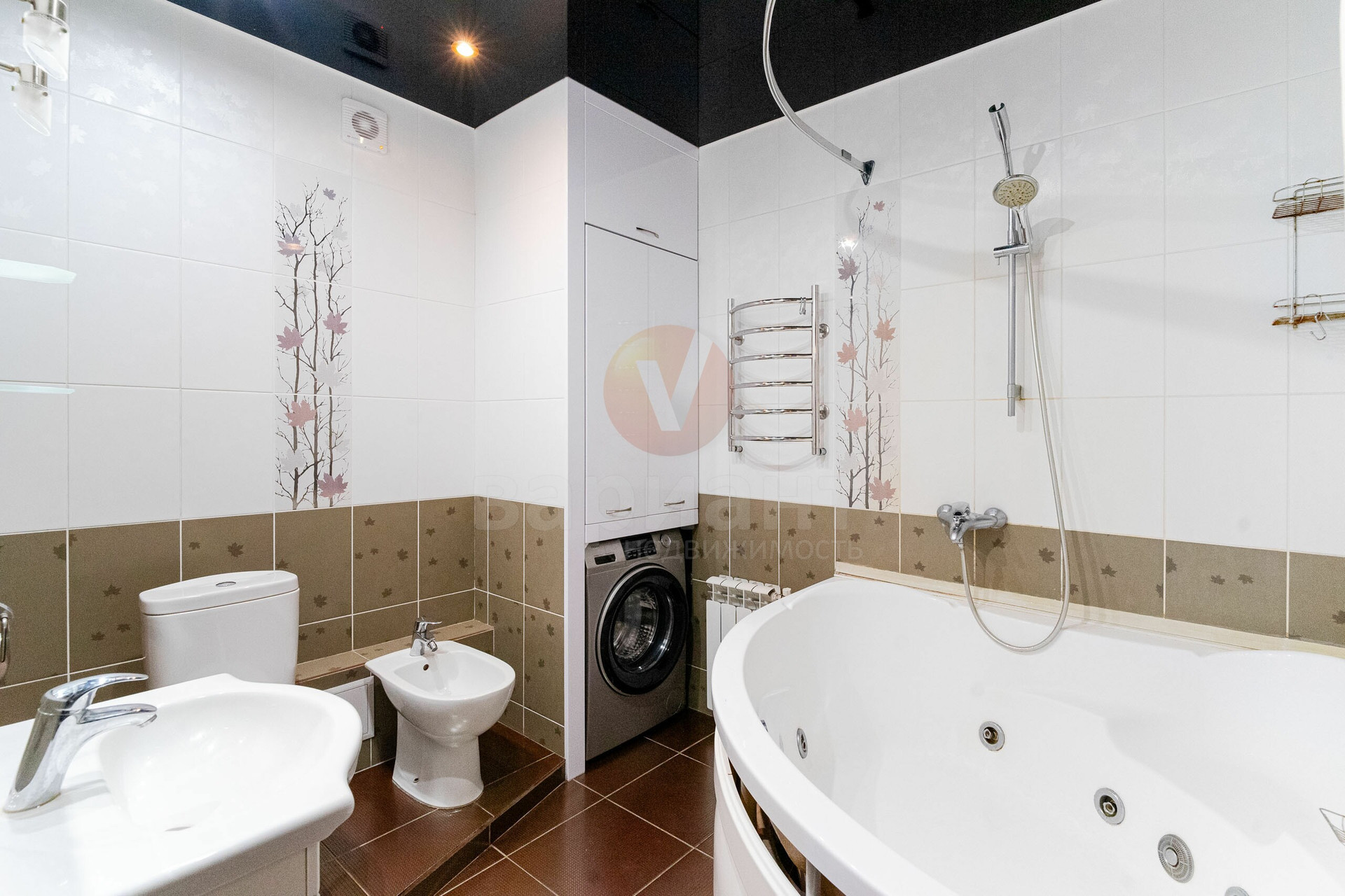 САН/УЗЕЛ 7м2: в кафеле, ванна с гидромассажем, биде, унитаз, раковина, стиральная машина.