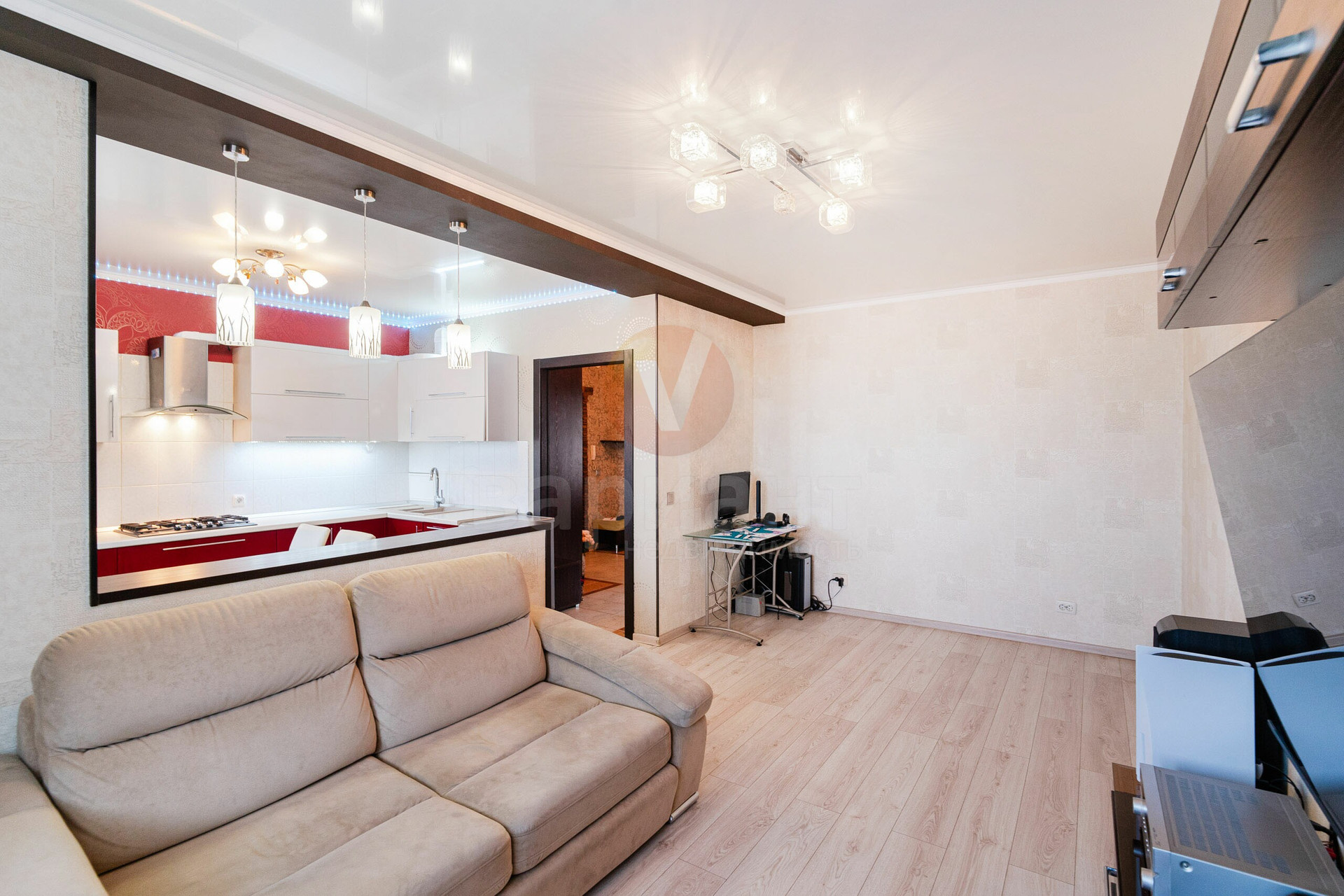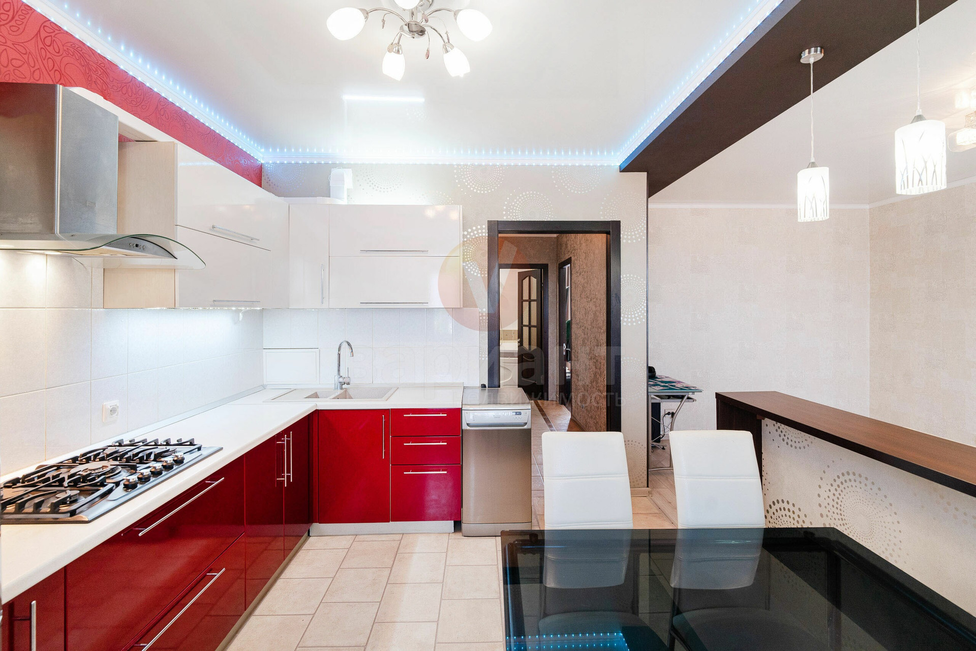 КУХНЯ 12 м2: выход на лоджию, окно ПВХ, кухонный гарнитур современный, варочная панель на 5 конфорок, духовой шкаф, вытяжка.