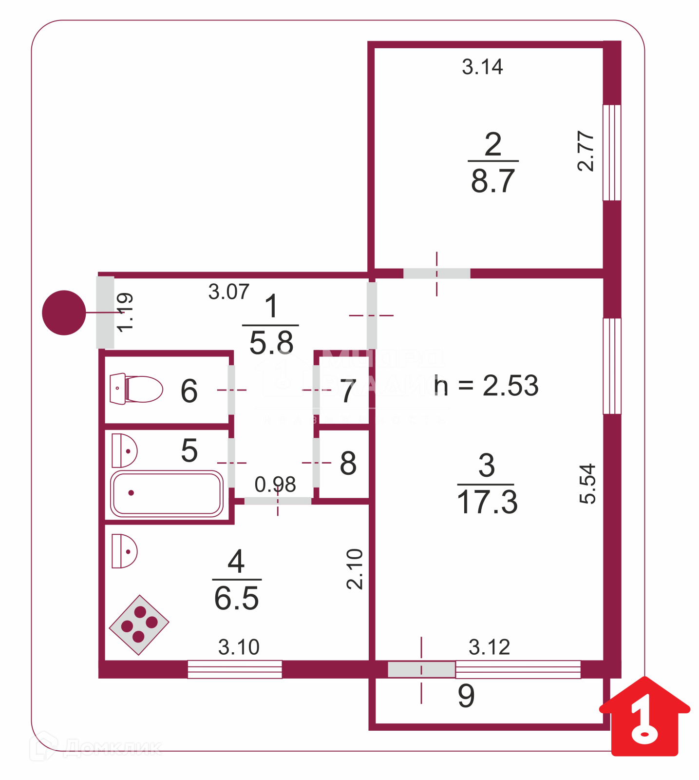 Высота потолков 2.5 м