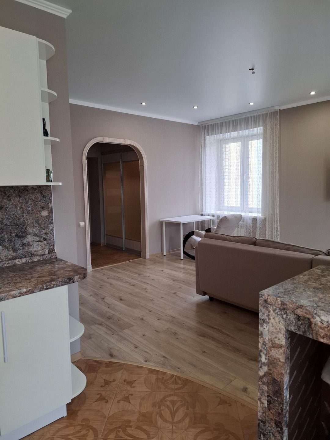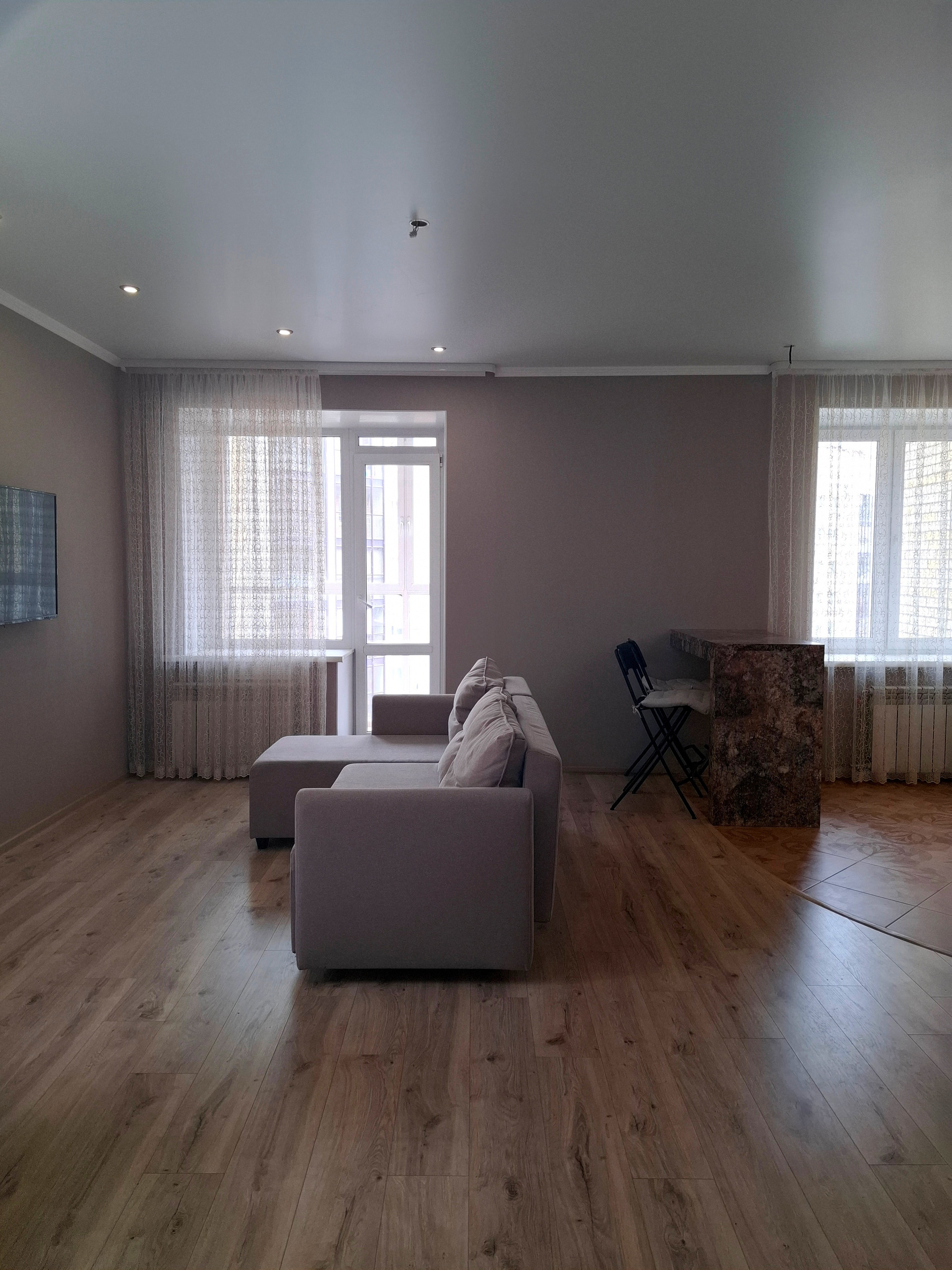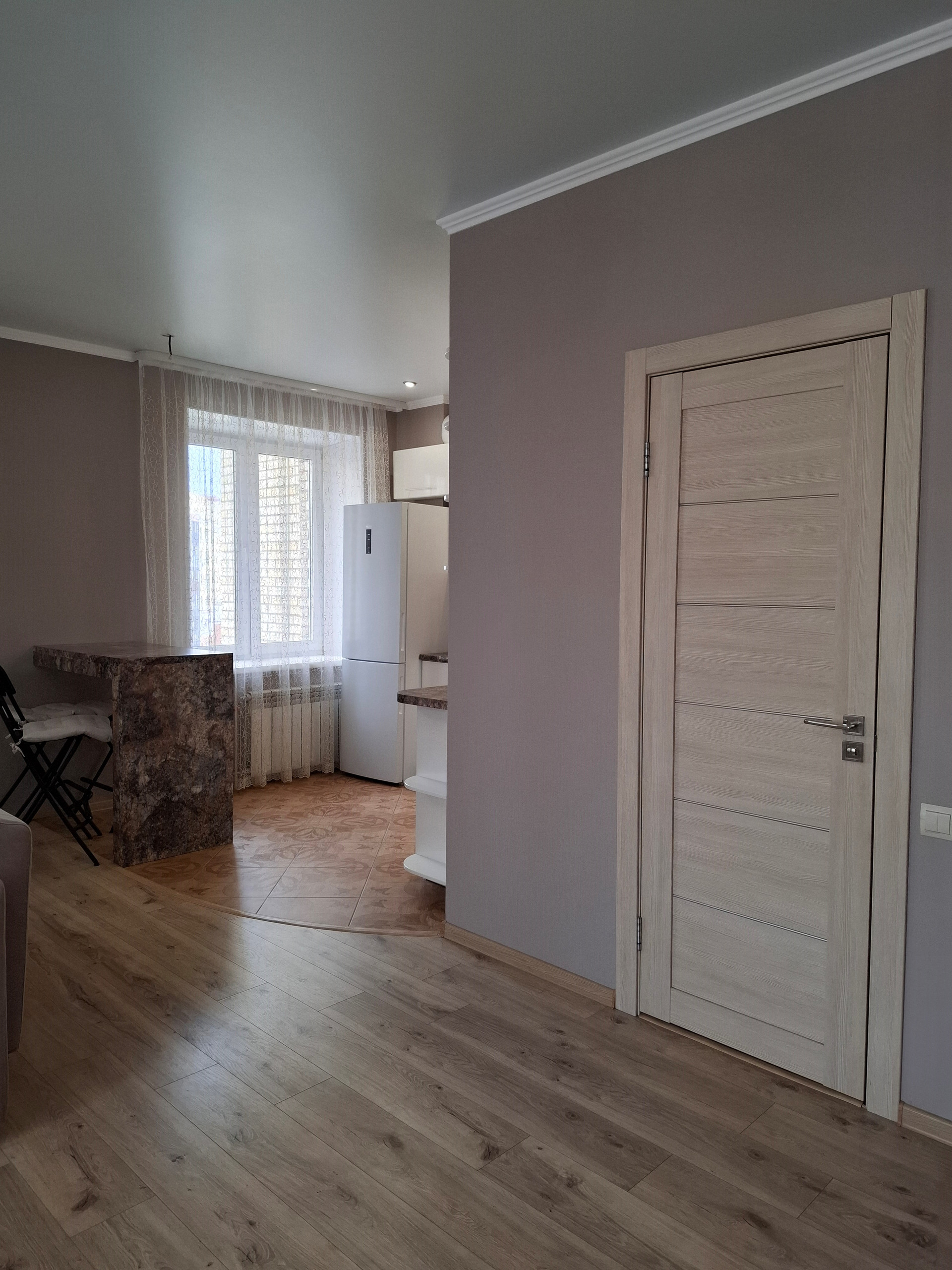 В квартире выполнен качественный ремонт из дорогостоящих материалов в светлых пастельных тонах. На полу ламинат 34 класса, потолки натяжные, санузел облицован кафельной плиткой!