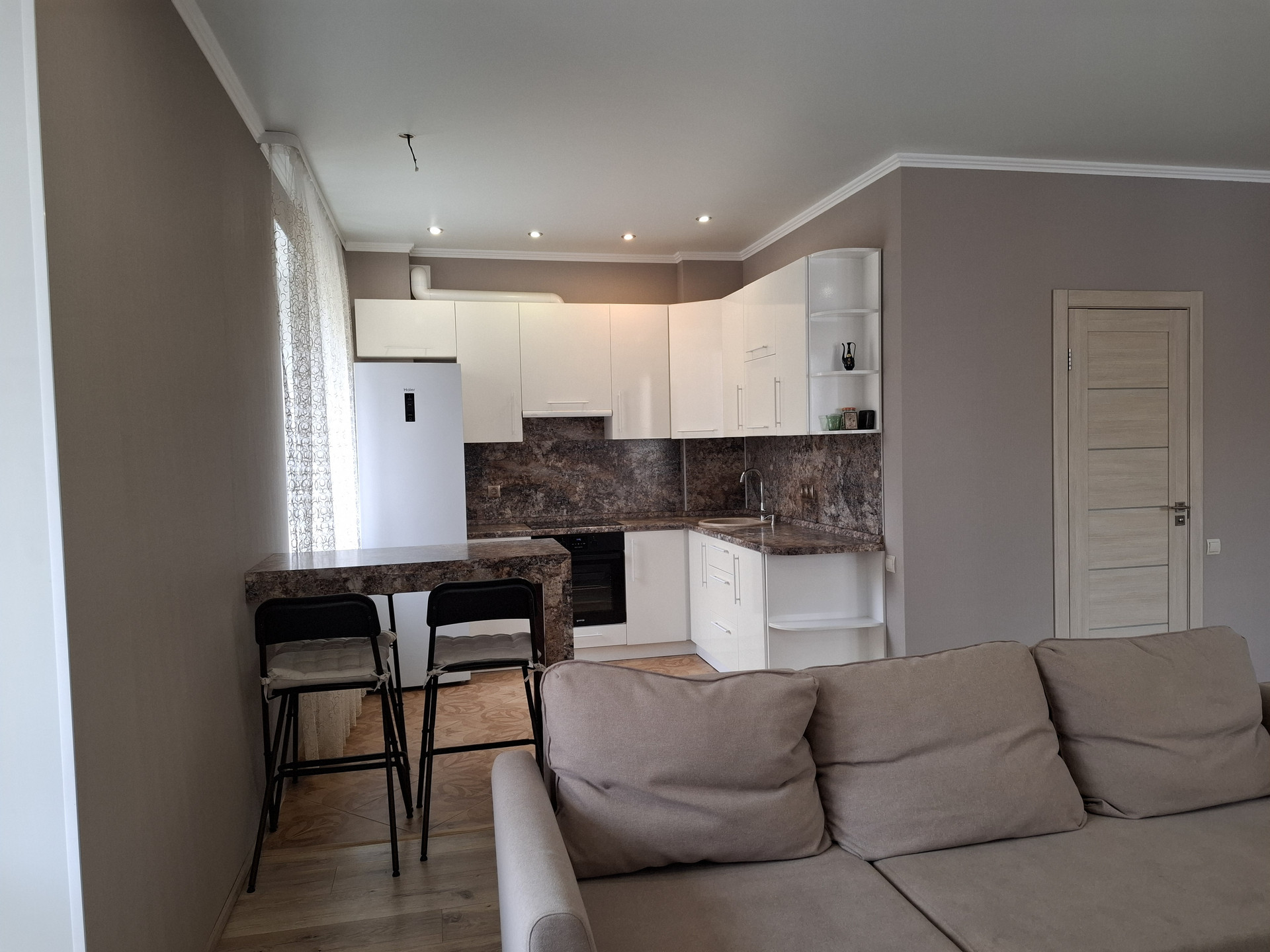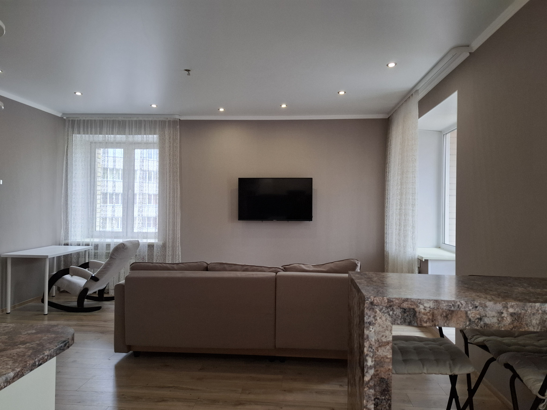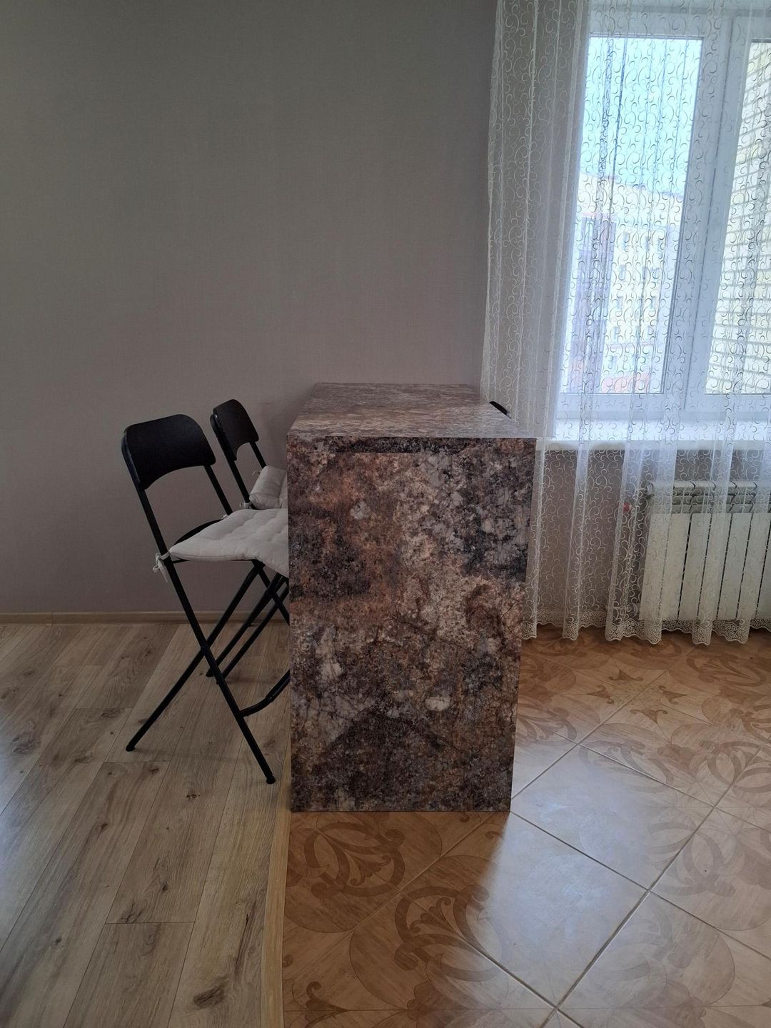 В квартире выполнен качественный ремонт из дорогостоящих материалов в светлых пастельных тонах. На полу ламинат 34 класса, потолки натяжные, санузел облицован кафельной плиткой!