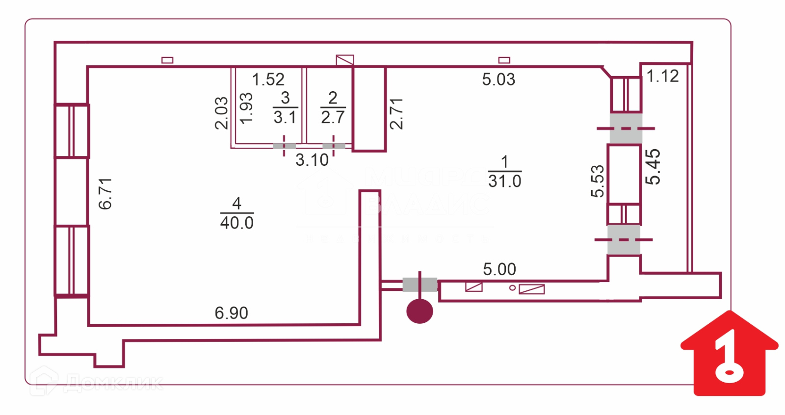 Жилая площадь 40.7 м2