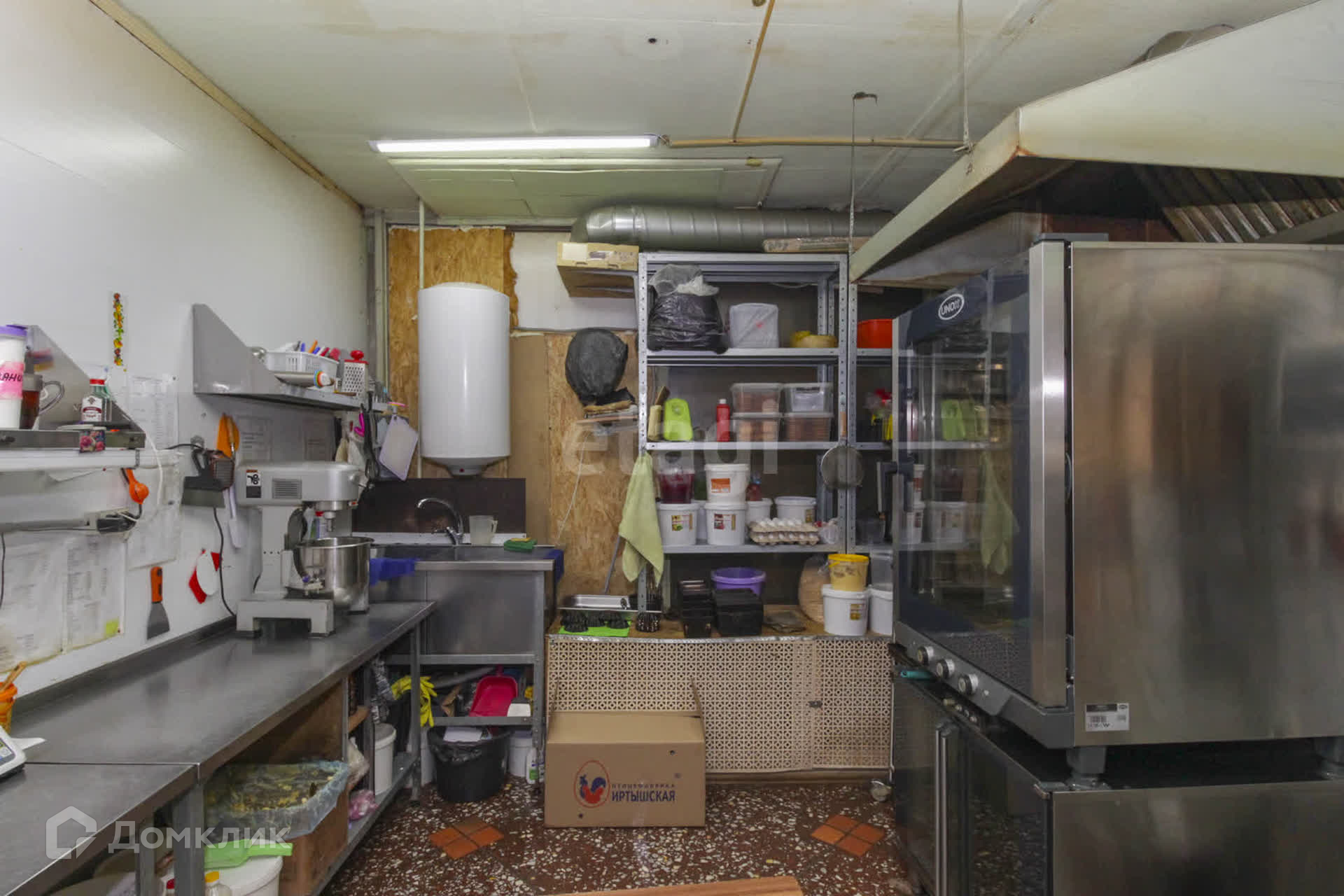Оборудована всем необходимым: вытяжной зонт, расстоечный шкаф, печь UNOX, тестомес, промышленный миксер, универсальный холодильный шкаф, ларь-холодильник, витрины для готовой продукции.