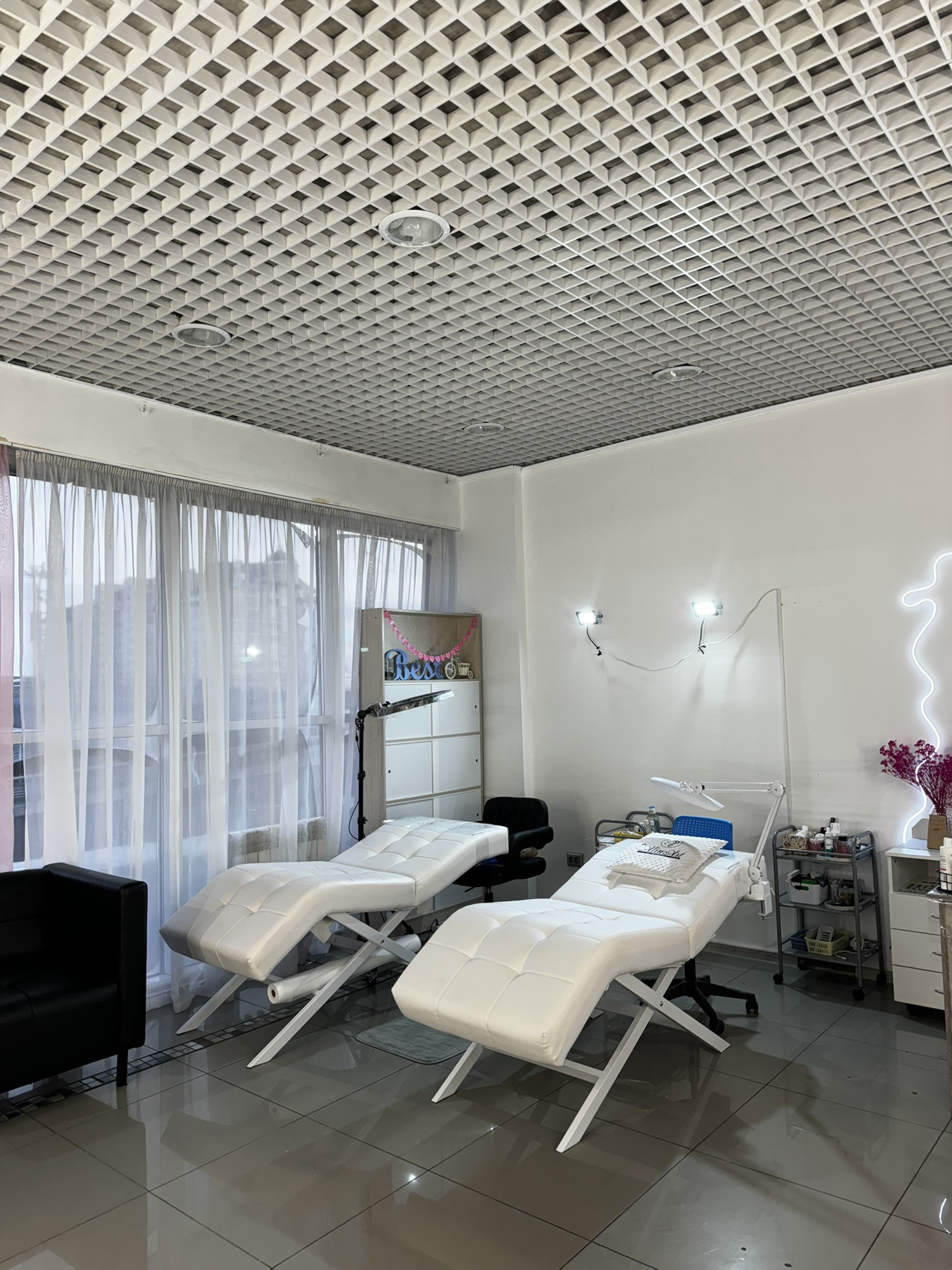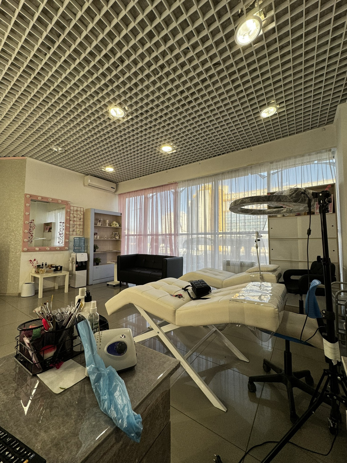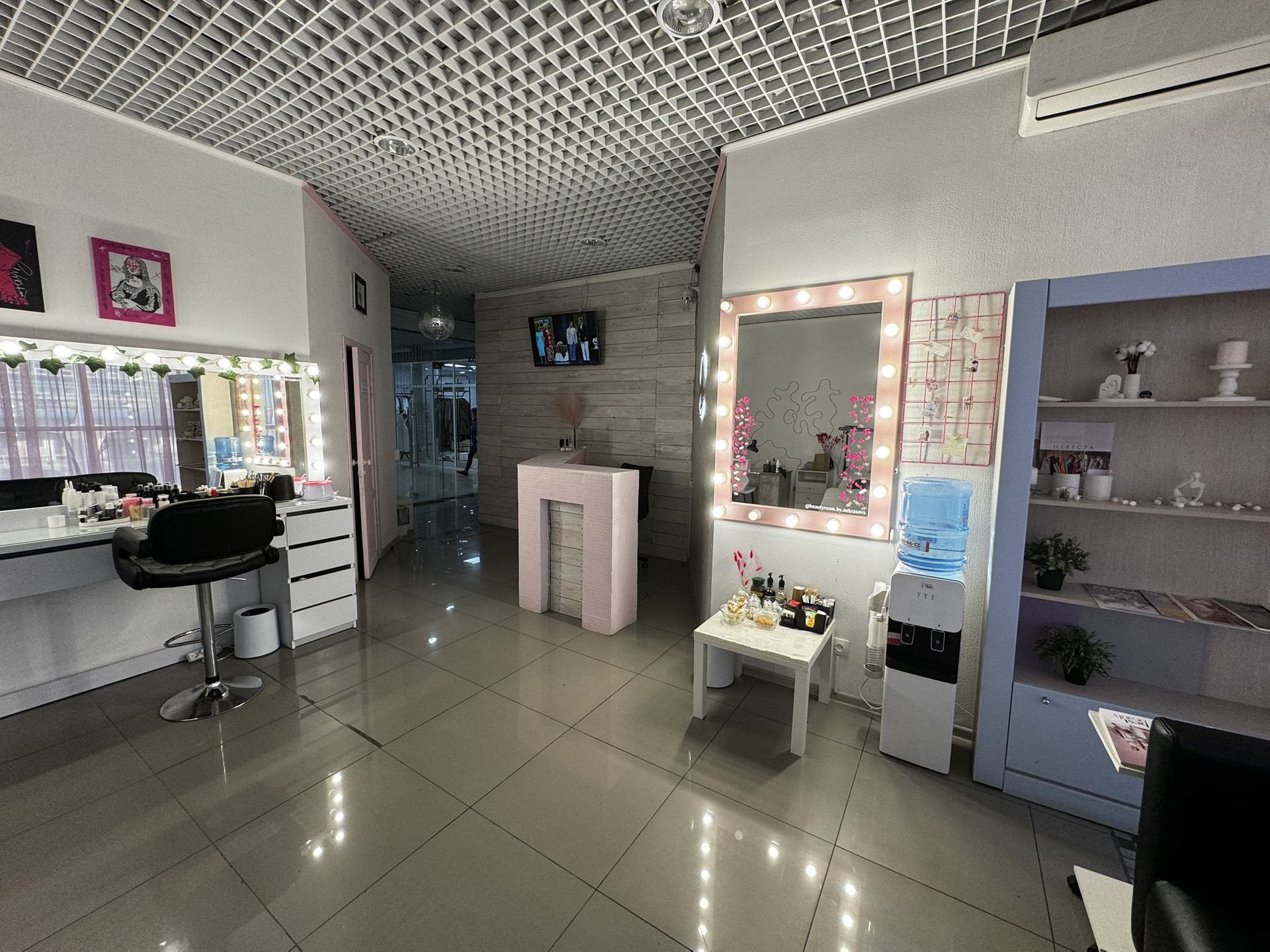 Что останется в студии : шкафы голубы, шкафчик с закрывающимися дверьками , ресепшен, комод , зеркало розовое с лампочками, шкаф для верхней одежды клиентов, швабры , ведра для мытья полов/окон, стол белый, органайзер для бахил, кондиционер,кушетка косметологическая прямая, диско-шар, 3 стула , микроволновка, чайник. Ящик с инструментами. Тюль (2шт( белая, розовая)). Часы настенные черные,белые. Доска маркерная для обучений. Кушетка белая для ресниц (1шт. НОВАЯ), стол в подсобном помещении, стол за ресепшеном,гирлянда на входной стене, бусы в качестве украшения, короб над входом светящийся ( вам останется только заказать демонтаж пленки на нем(контакты также дам все), стол бровиста большой белый с лампочками. Телевизор. Диван также новый, кожаный. Сухожар, уф сушилка для инструментов.