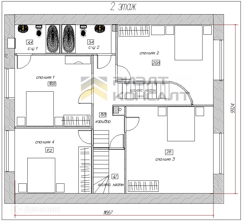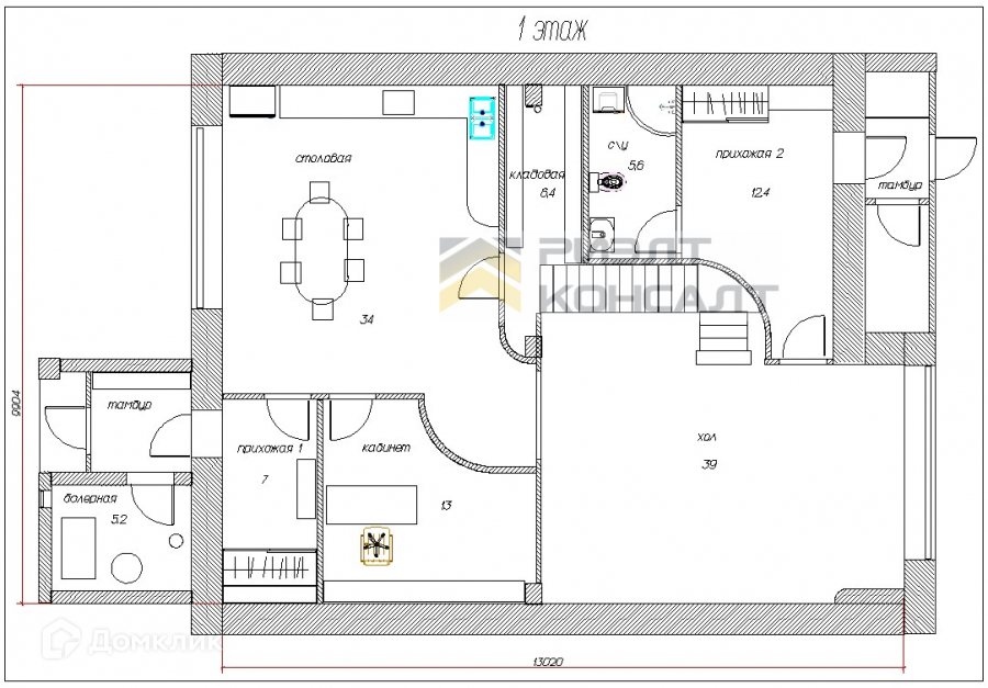На 1 этаже дома размещены: холл, столовая, кабинет, санузел, две прихожие, бойлерная, кладовая, погреб, на 2 этаже: четыре спальни и два санузла, на 3 этаже: бильярдная, мастерская, две гардеробные.