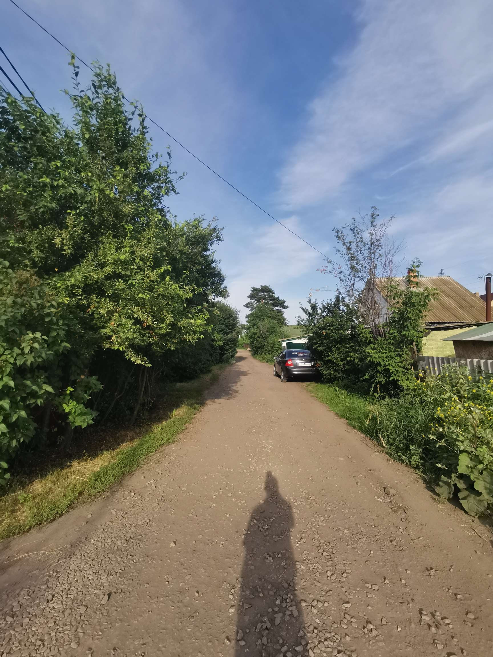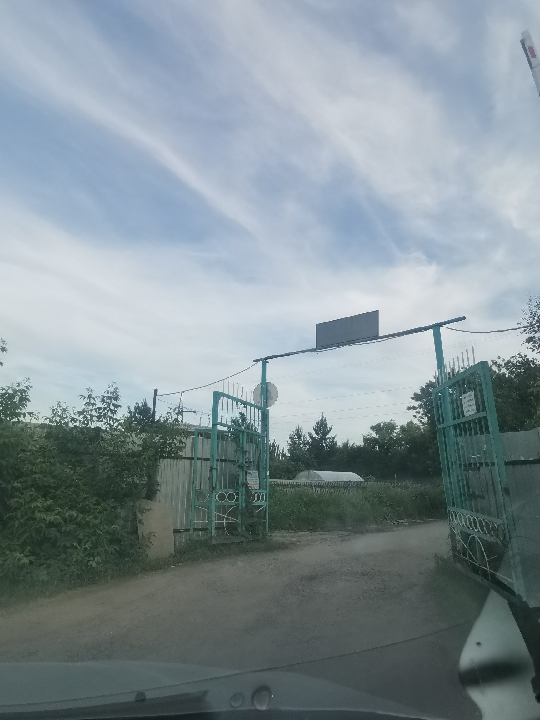 Въезд на участок оборудован распашными металлическими воротами и автостоянкой для автомобиля.