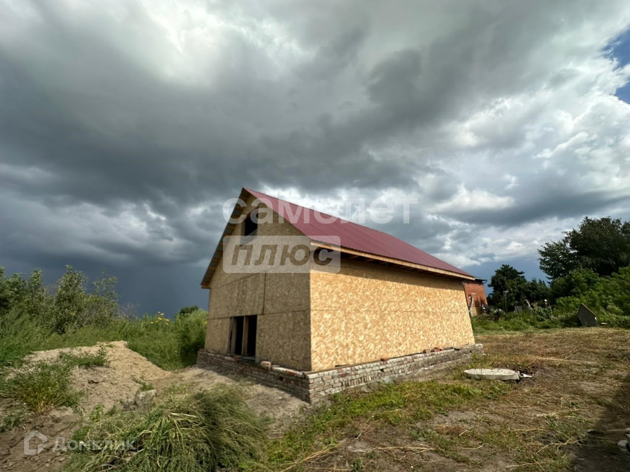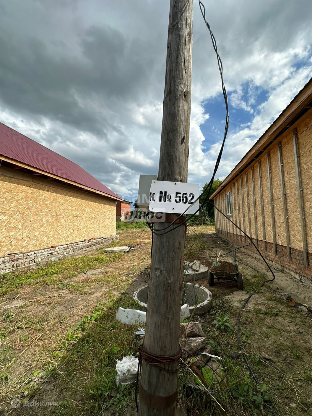 На участке начато строительство дома из бруса, на крыше профнастил.