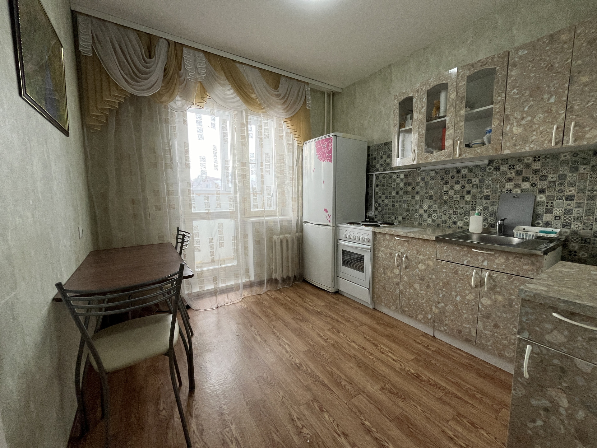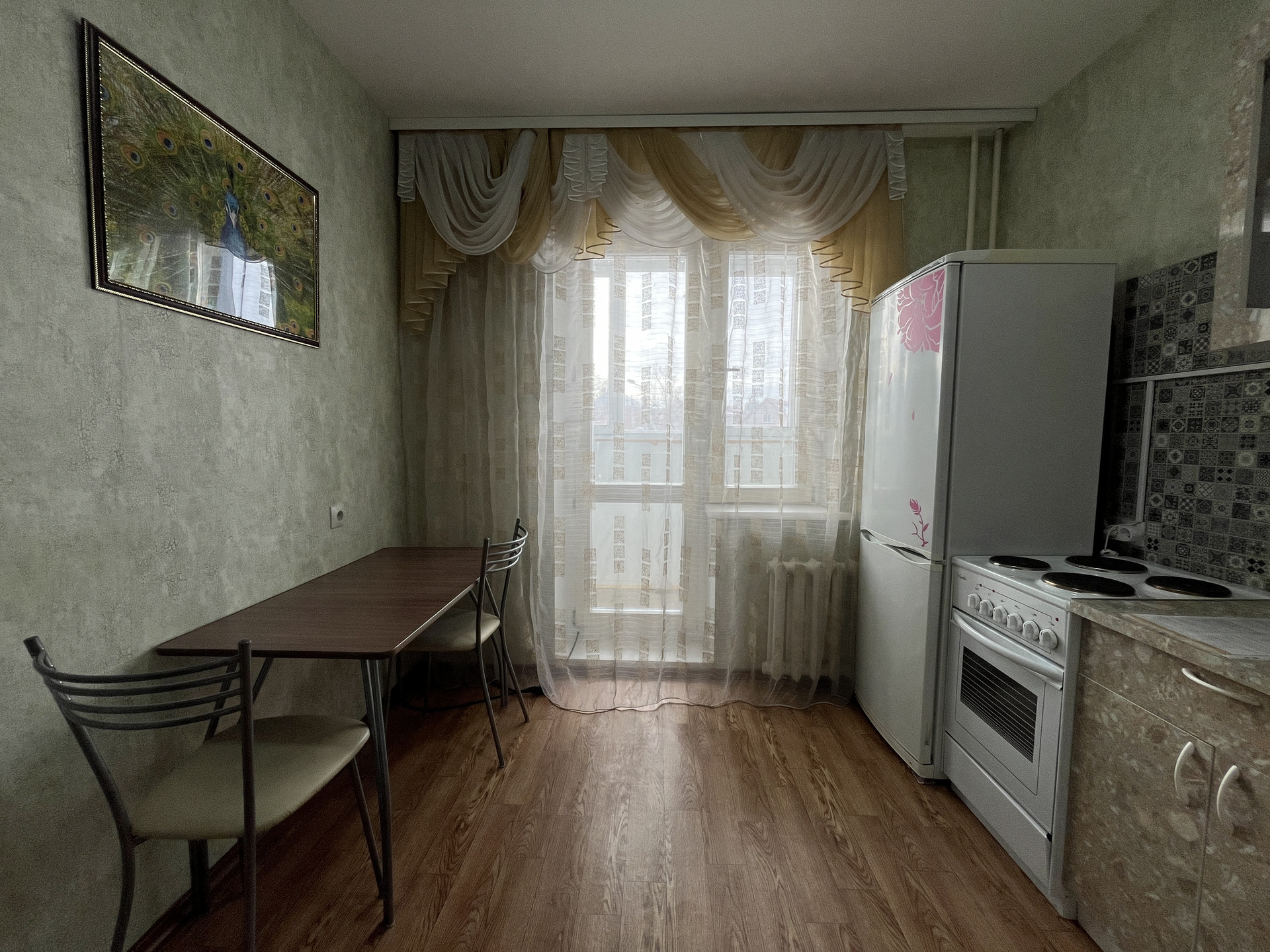 Кухня 9 кв.м., кухонный гарнитур, электро.плита, обеденная зона, стулья.