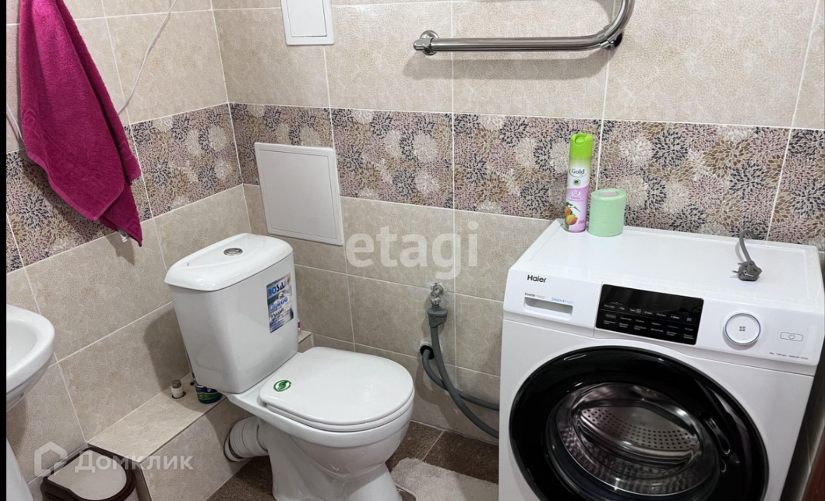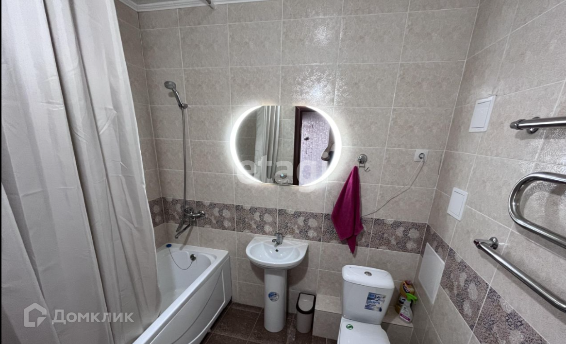 Светлая ванная оснащена новой стиральной машиной и зеркалом с подсветкой перед которым очень удобно любоваться собой.