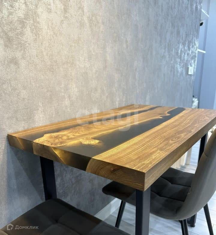 Кухня: встраиваемая техника Haier: индукционная варочная панель, духовой шкаф и вытяжка, посудомоечная машина Midea, холодильник Siemens, обеденный стол из сруба дерева и эпоксидной смолы, стулья, микроволновая печь, чайник, посуда, столовые приборы.