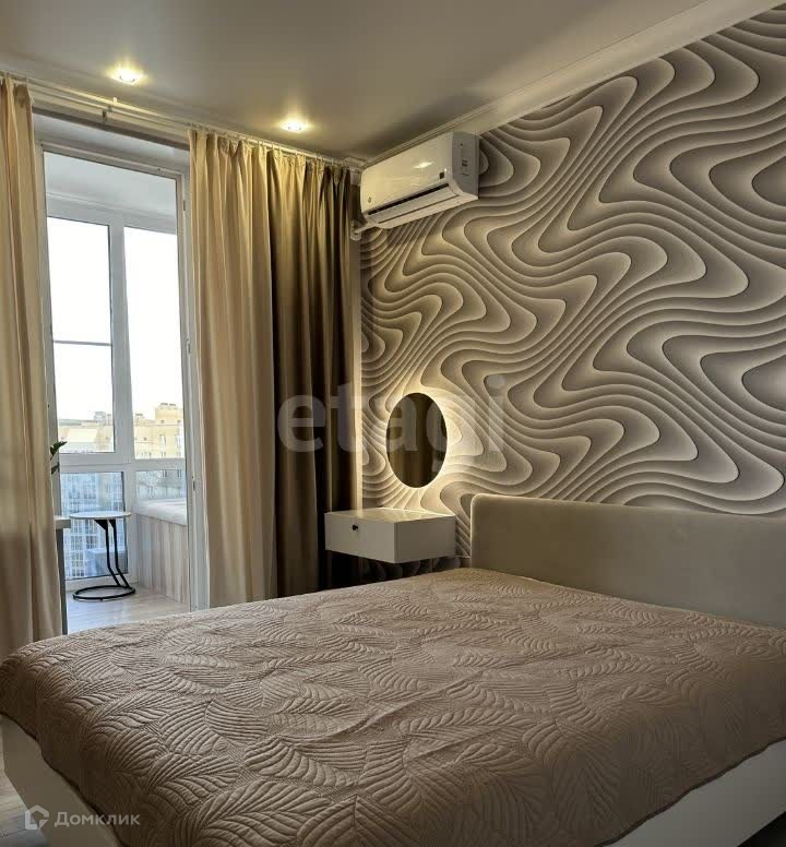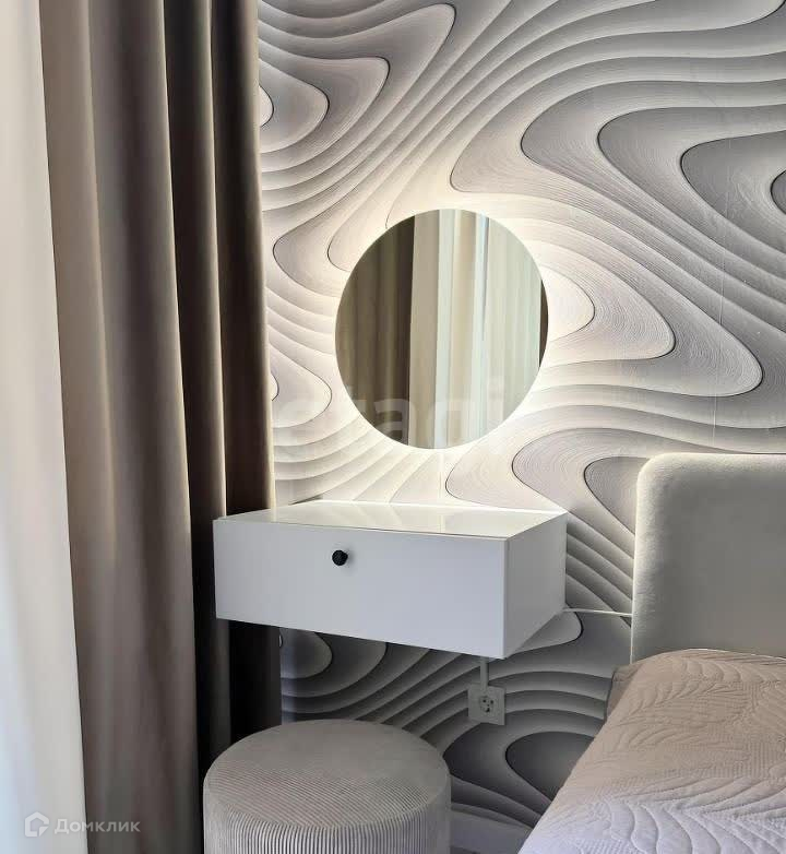 Спальня: кондиционер, кровать с подъемным механизмом и матрас аскона, шкаф, изготовленный на заказ с продуманной системой хранения, подвесной столик и зеркало.