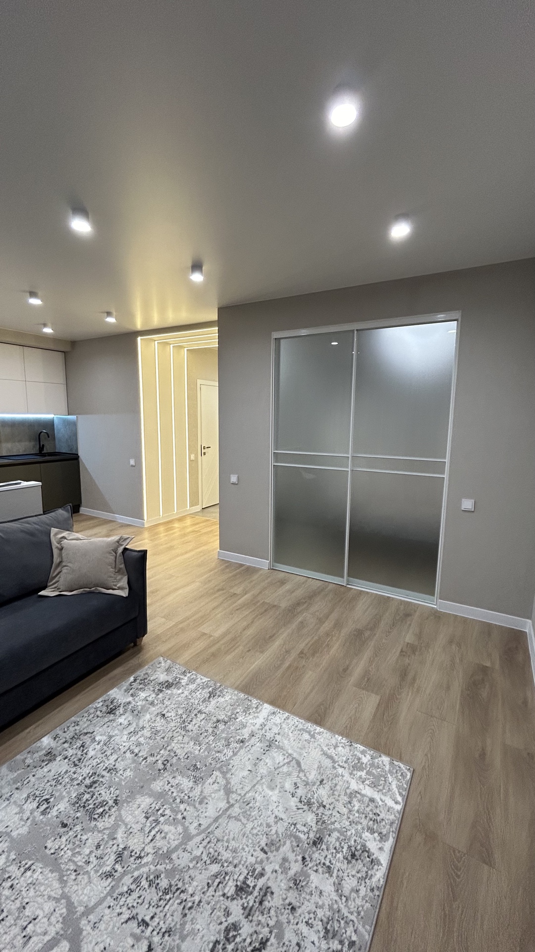 Планировка: объединённая гостиная-кухня с выходом на лоджию с панорамным остеклением, выделенная зона спальни, совмещённый санузел.