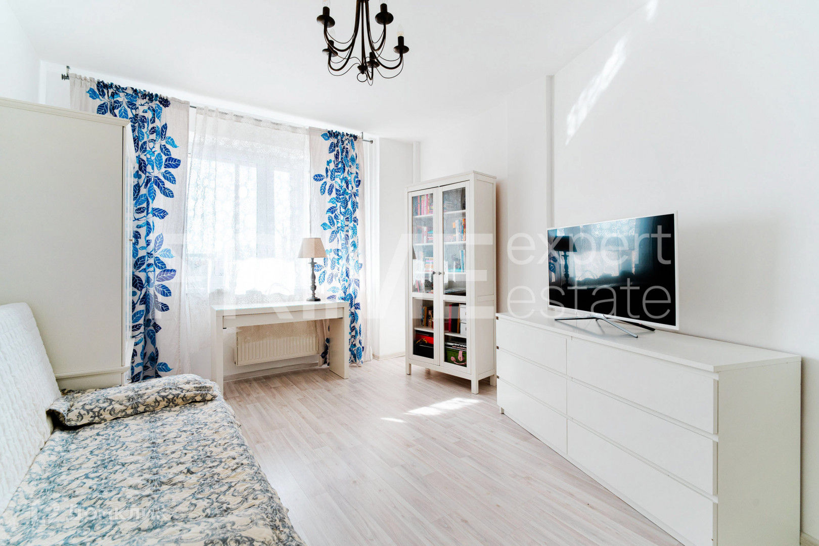 спальня с двухспальным диваном для сна, телевизором и  эргономичными шкафами для хранения вещей фирмы Икея;