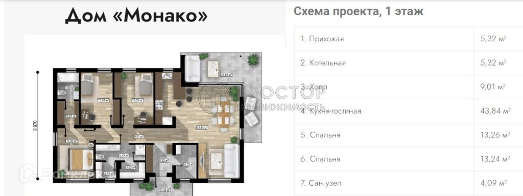 Код объекта: 1264356. Дом Монако — большой одноэтажный дом с сауной и панорамными окнами в пол. «Монако» выгодно отличается стильным фасадом из облицовочной штукатурки и дерева. В доме предусмотрена светлая кухня-гостиная, три уютные спальни в приватной зоне дома, мастер-спальня с гардеробом и отдельным сан. узлом, просторная терраса для летнего отдыха.