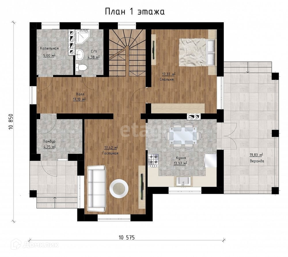 Потолки — 1-ый этаж 3м, 2-ой этаж 2,75м.