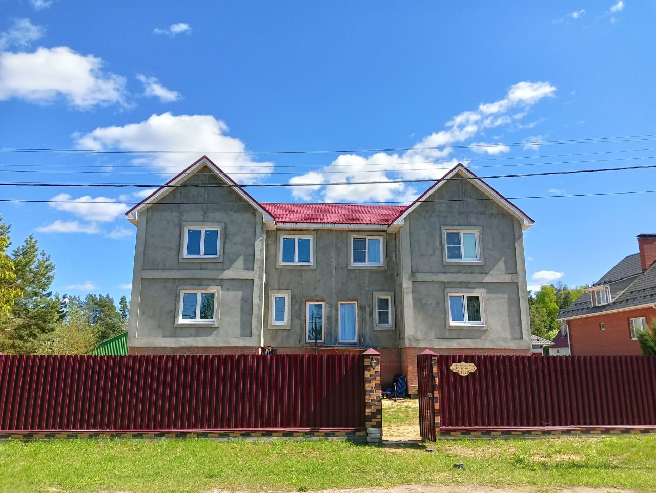 Забор сделан из металлопрофеля имеет одни откатные электрические ворота., одни распашные, одна калитка.
