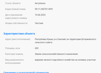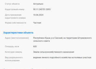 Продам хороший участок 6 соток в село Штормовое. Участок правильной прямоугольной формы, по периметру не огорожен, разработан. Межевание проведено ( уточненная площадь). Категория земель: земли сельскохозяйственного назначения. Вид разрешенного использования: ведение личного подсобного хозяйства на полевых участках. Все коммуникации рядом с участком... |